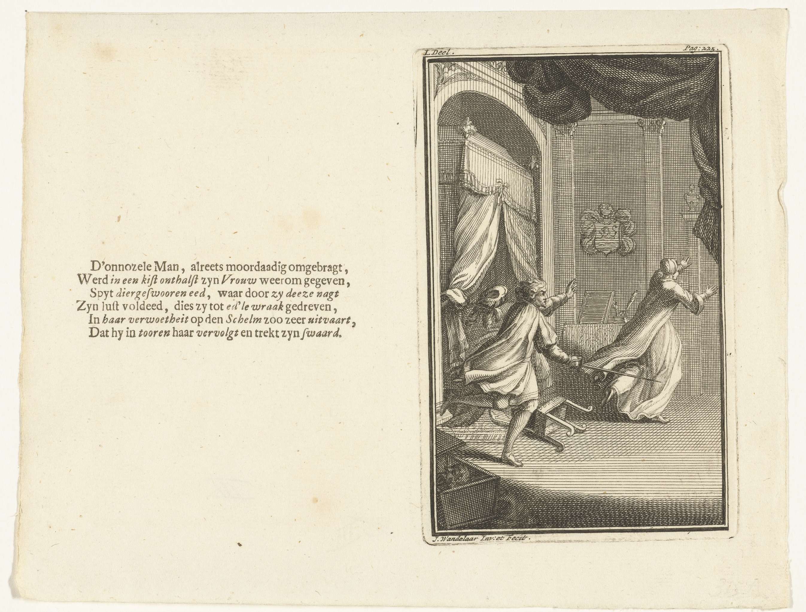 Scène uit een toneelstuk naar het verhaal van de rechtspraak van Karel de Stoute over de gouverneur van Zeeland, ca. 1474. Ook bekend als het verhaal van Rhynsault en Saphira. In deze bewerking als de landvoogd en Lucretia. Met links van de voorstelling zes regels begeleidende tekst.