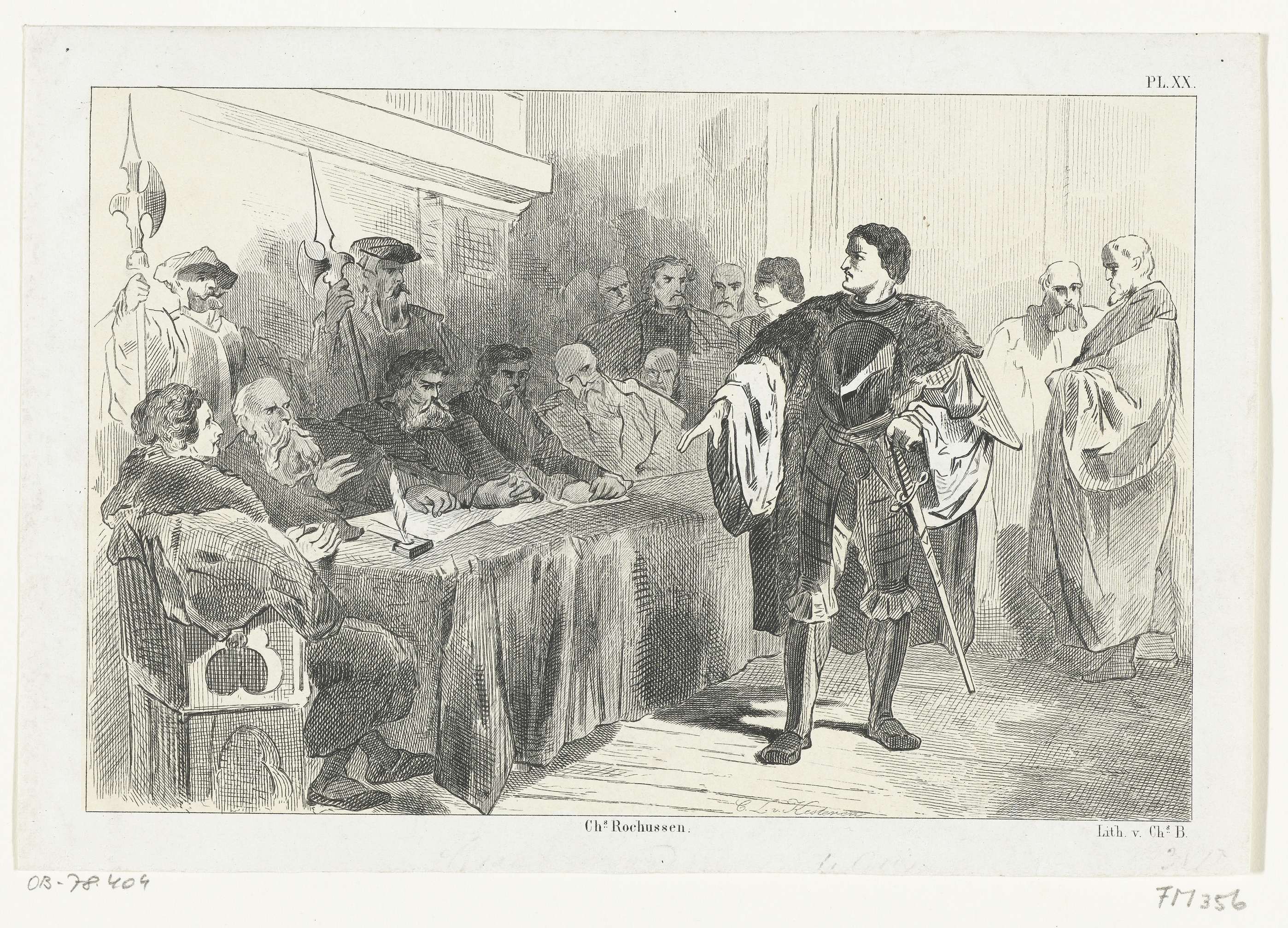 Edzard I de Grote, graaf van Oost-Friesland, staande in wapenrusting voor de raadsleden van de stad Groningen, 3 november 1514.