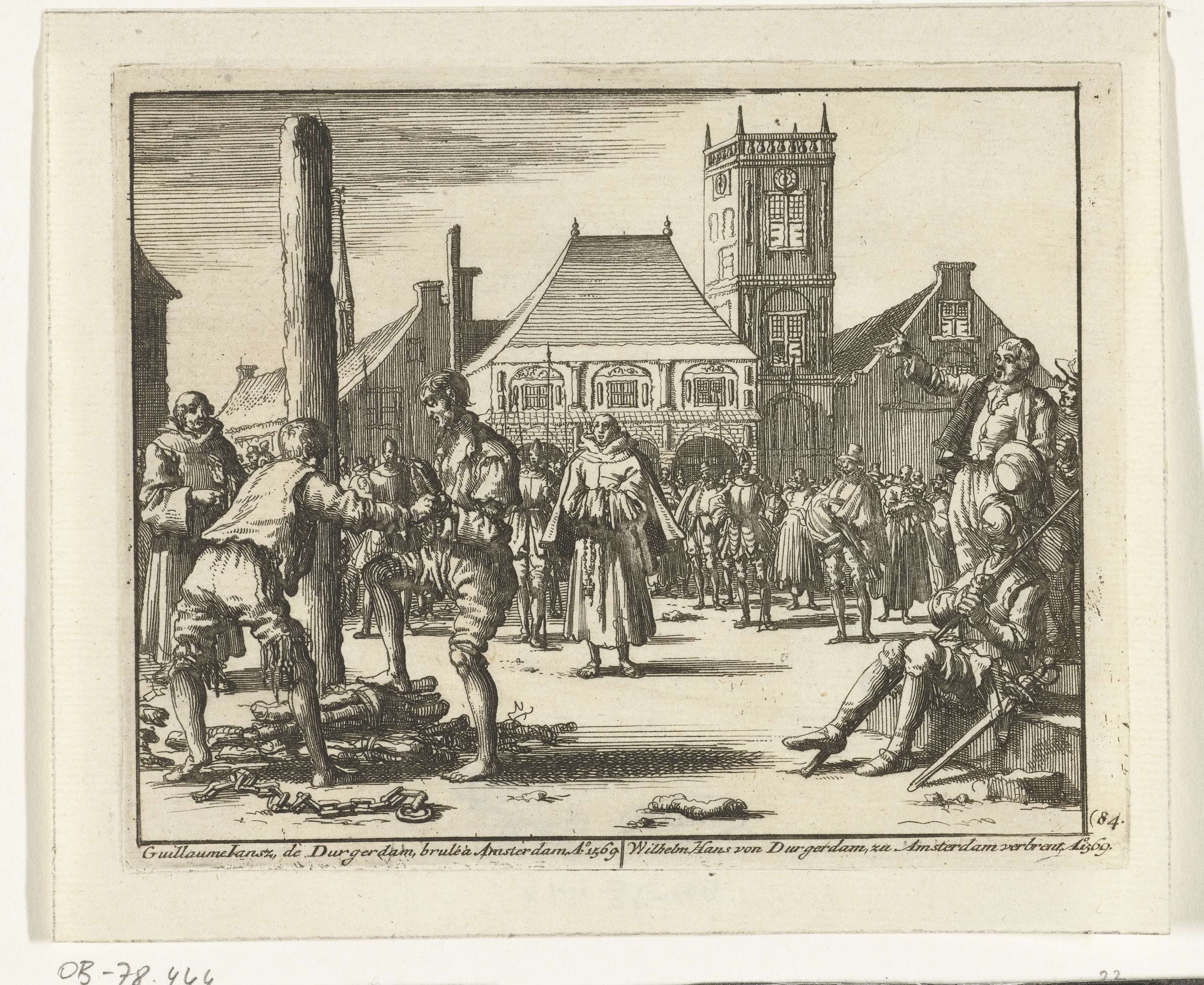 De doopsgezinde Willem Jansz. uit Durgerdam klimt op de brandstapel te Amsterdam, 1569. Op de Dam voor het oude stadhuis. Op de achtergrond monniken en soldaten.