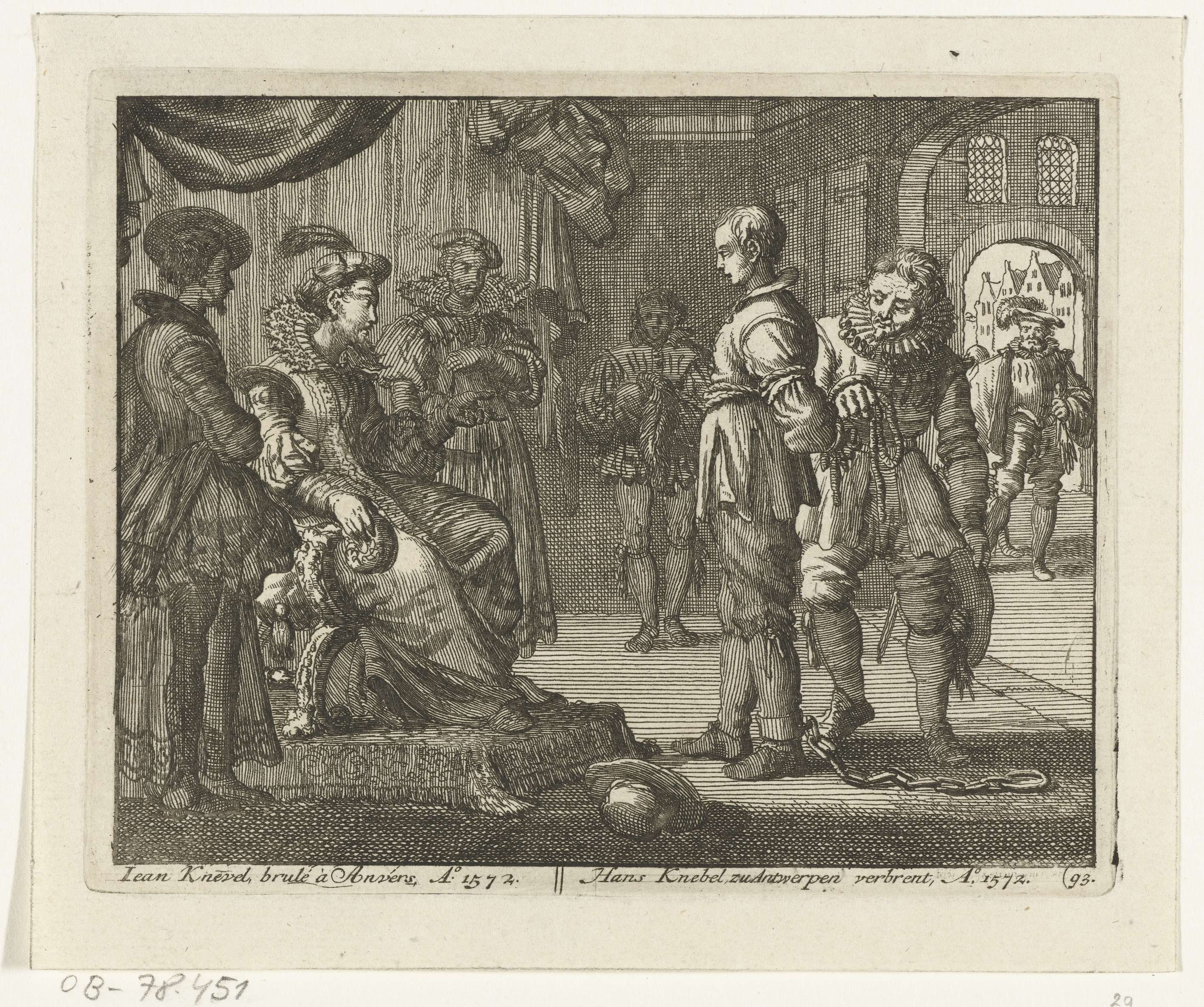 De doopsgezinde Hans Knevel te Antwerpen verhoord en later verbrand, 1572. De gevangene staande voor een vrouw op een troon.