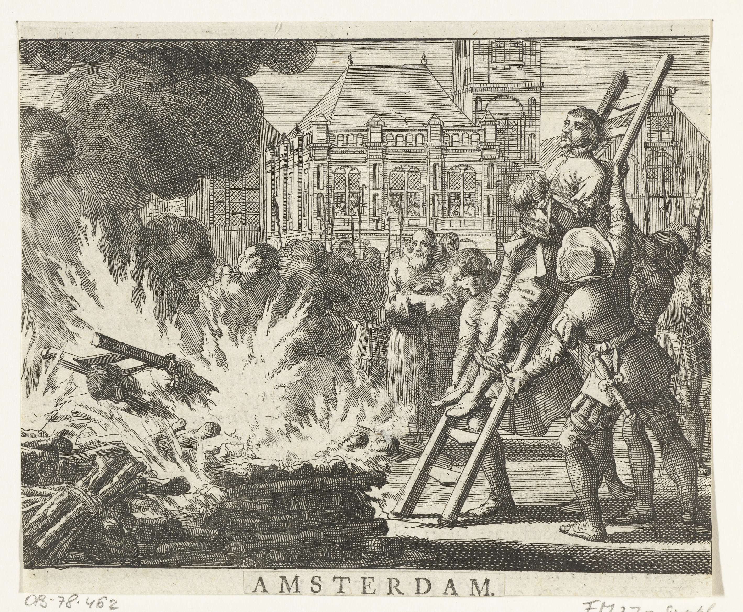 Dopers Jacob de Geldersman en Dirk Pietersz. Smuel op de Dam te Amsterdam op ladders verbrand op de brandstapel, 1546. Onder de prent een strook papier gepklakt waarop staat: Amsterdam.