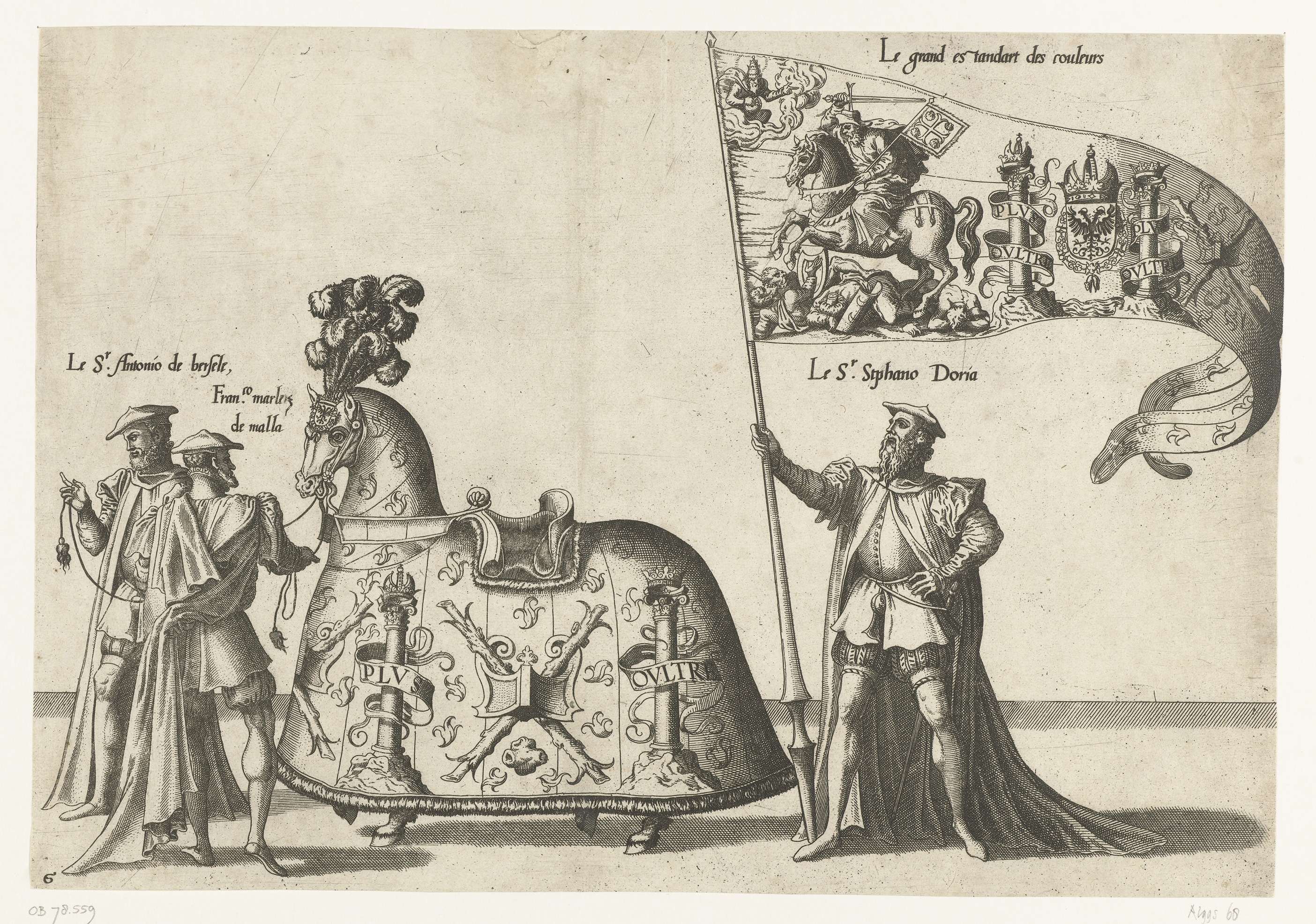 Drie deelnemers aan de optocht, een paard versierd met het devies en embleem van de keizer, vaandel met Matamoros (H. Jacobus die de Moren verslaat). Onderdeel van de prentreeks van de Begrafenisoptocht van keizer Karel V op 29 december 1558 te Brussel.