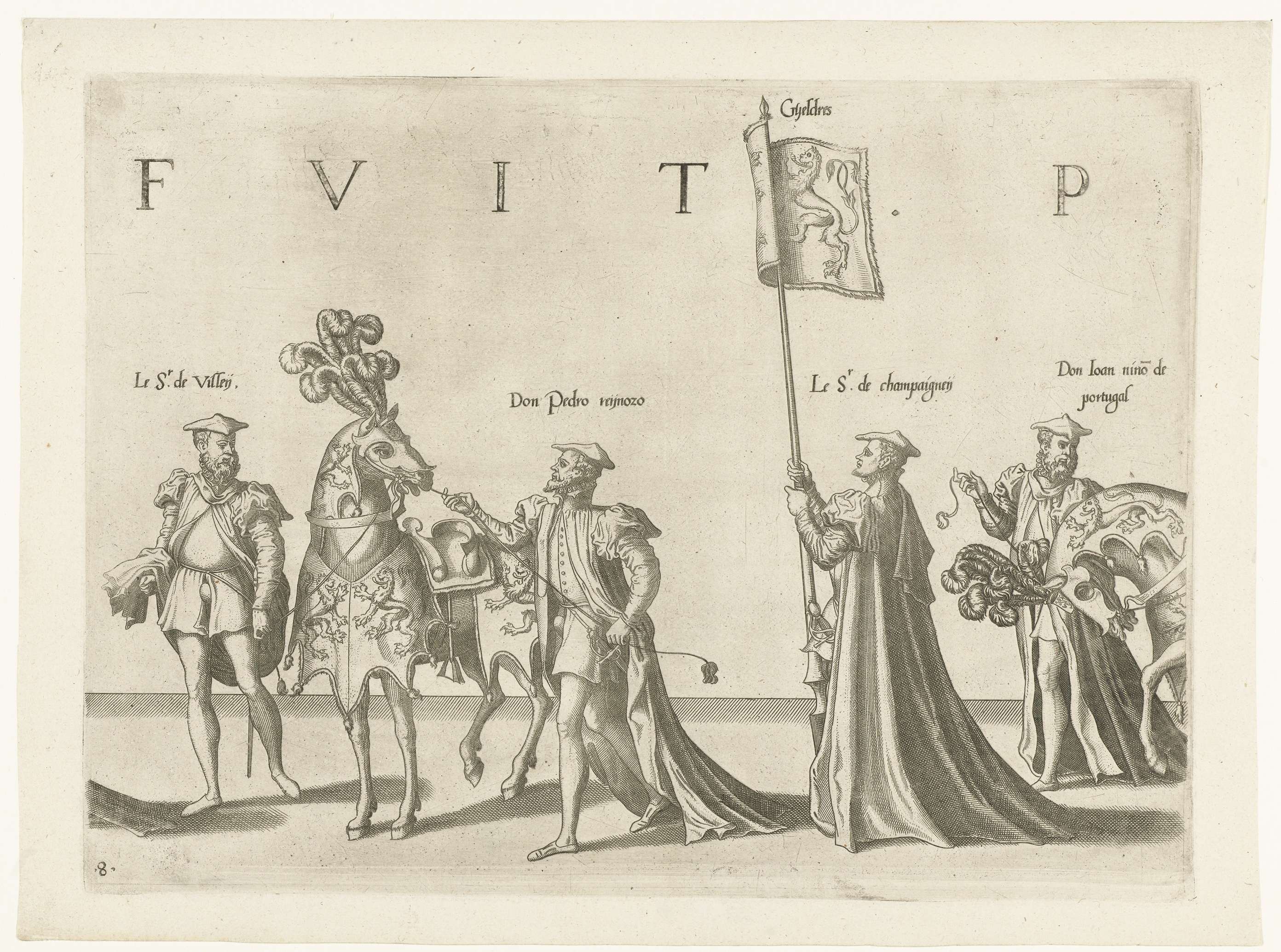 Vier deelnemers aan de optocht, paarden en het vaandel met het wapen van Gelre. Onderdeel van de prentreeks van de Begrafenisoptocht van keizer Karel V op 29 december 1558 te Brussel.