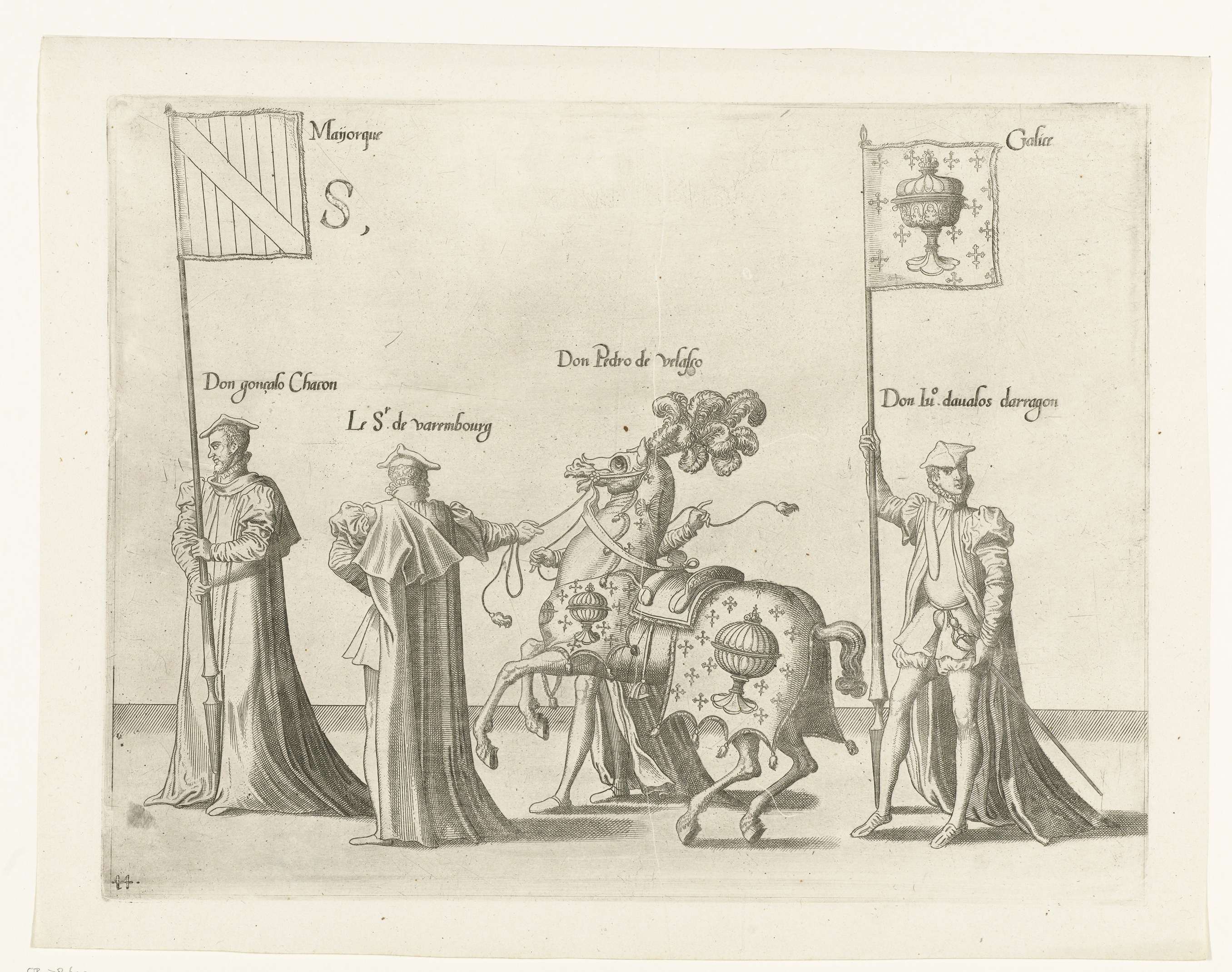 Vier deelnemers aan de optocht, paarden en de vaandels met de wapens van Mallorca en Galicië. Onderdeel van de prentreeks van de Begrafenisoptocht van keizer Karel V op 29 december 1558 te Brussel.