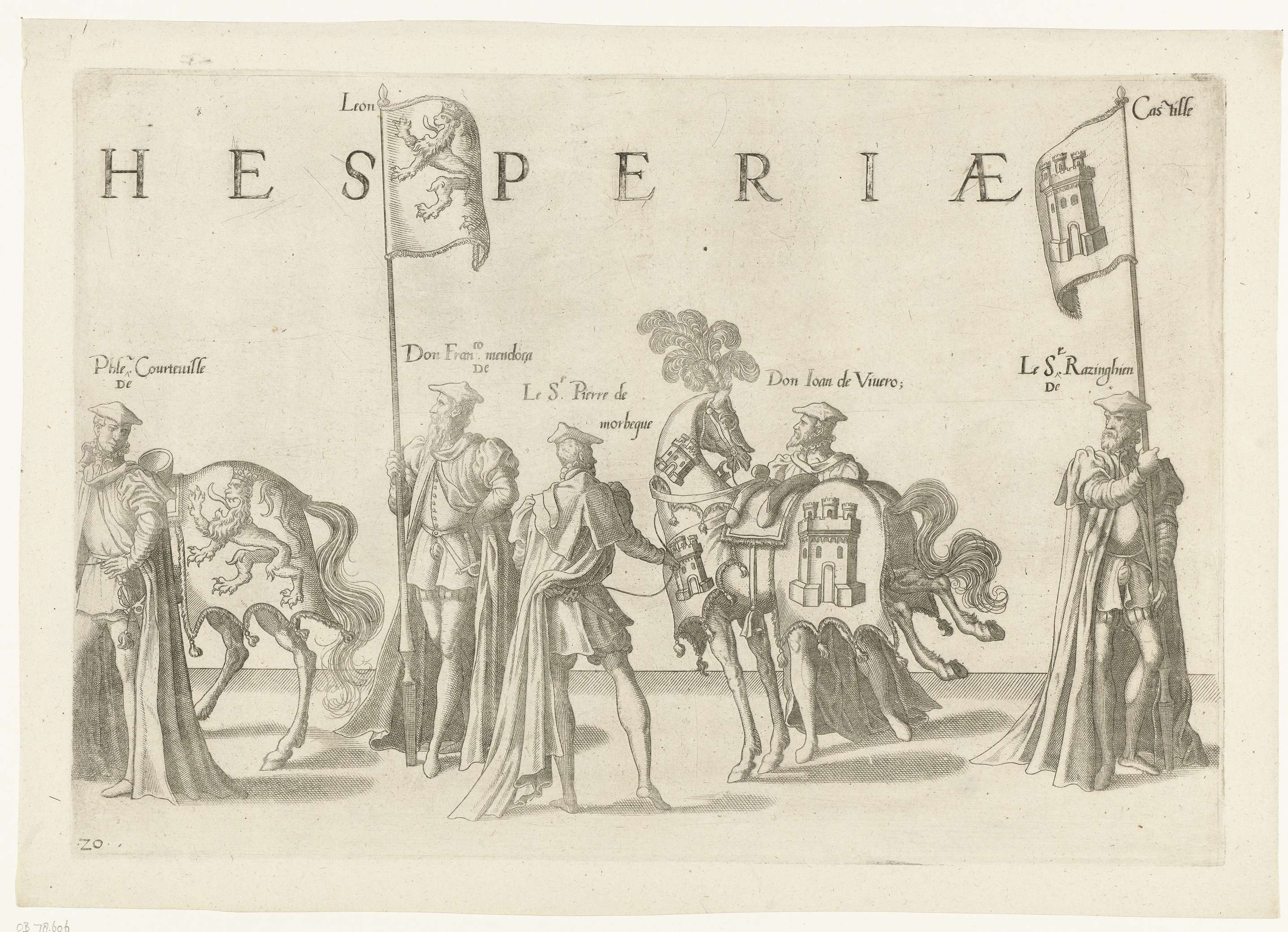 Vijf deelnemers aan de optocht, paarden en de vaandels met de wapens van Castilla en León. Onderdeel van de prentreeks van de Begrafenisoptocht van keizer Karel V op 29 december 1558 te Brussel.