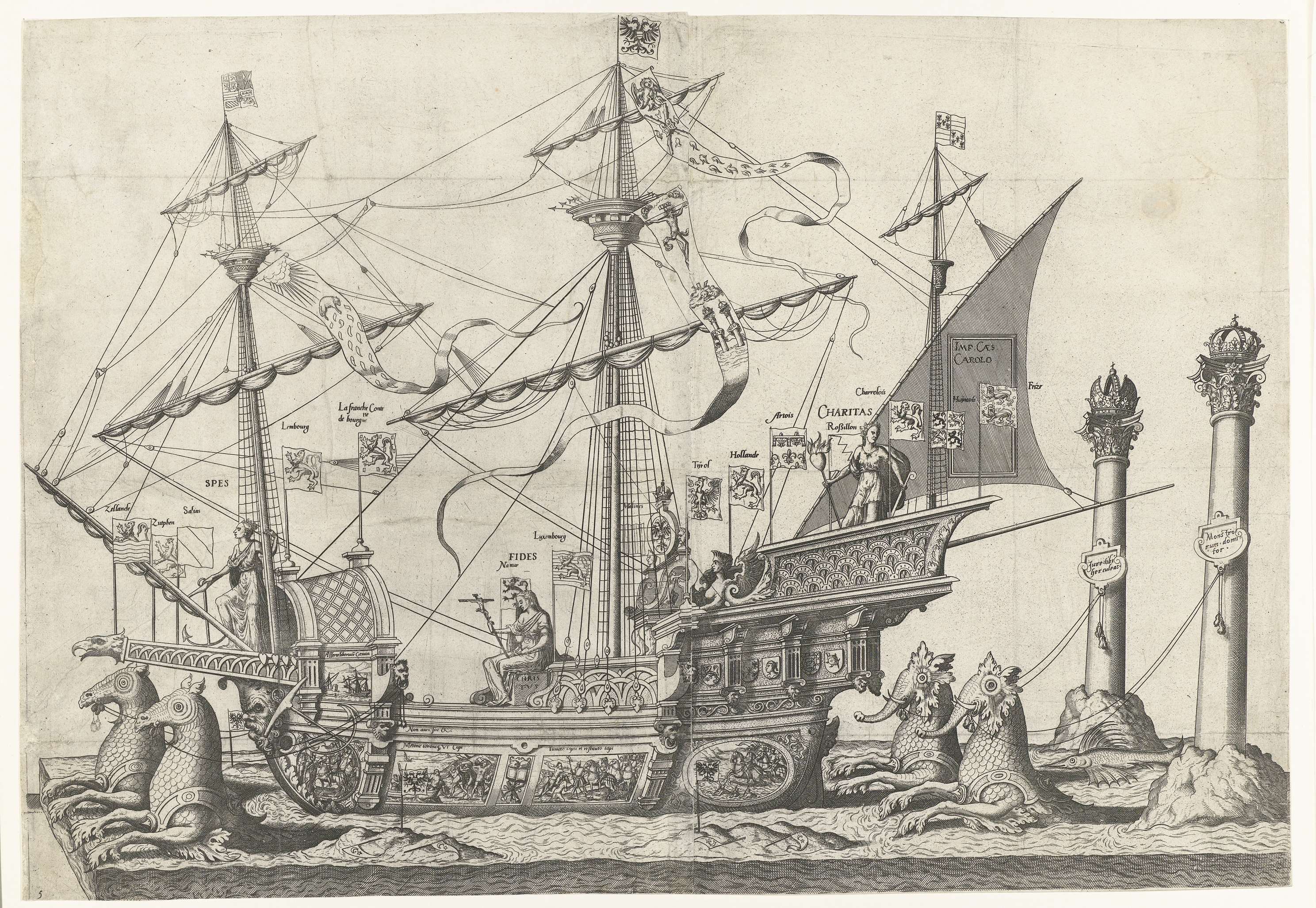 Praalwagen met het schip Victoria. Op het schip vrouwelijke personificaties van Hoop, Geloof en Liefde, vlaggen van de provincies van de Nederlanden, vaandels met Christelijke allegorieën. Voor het schip twee zeepaarden, erachter twee zeeolifanten. Achteraan de twee zuilen van Hercules. De zijkanten van het schip versierd met voorstellingen van overwinningen van Karel V. Onderdeel van ...