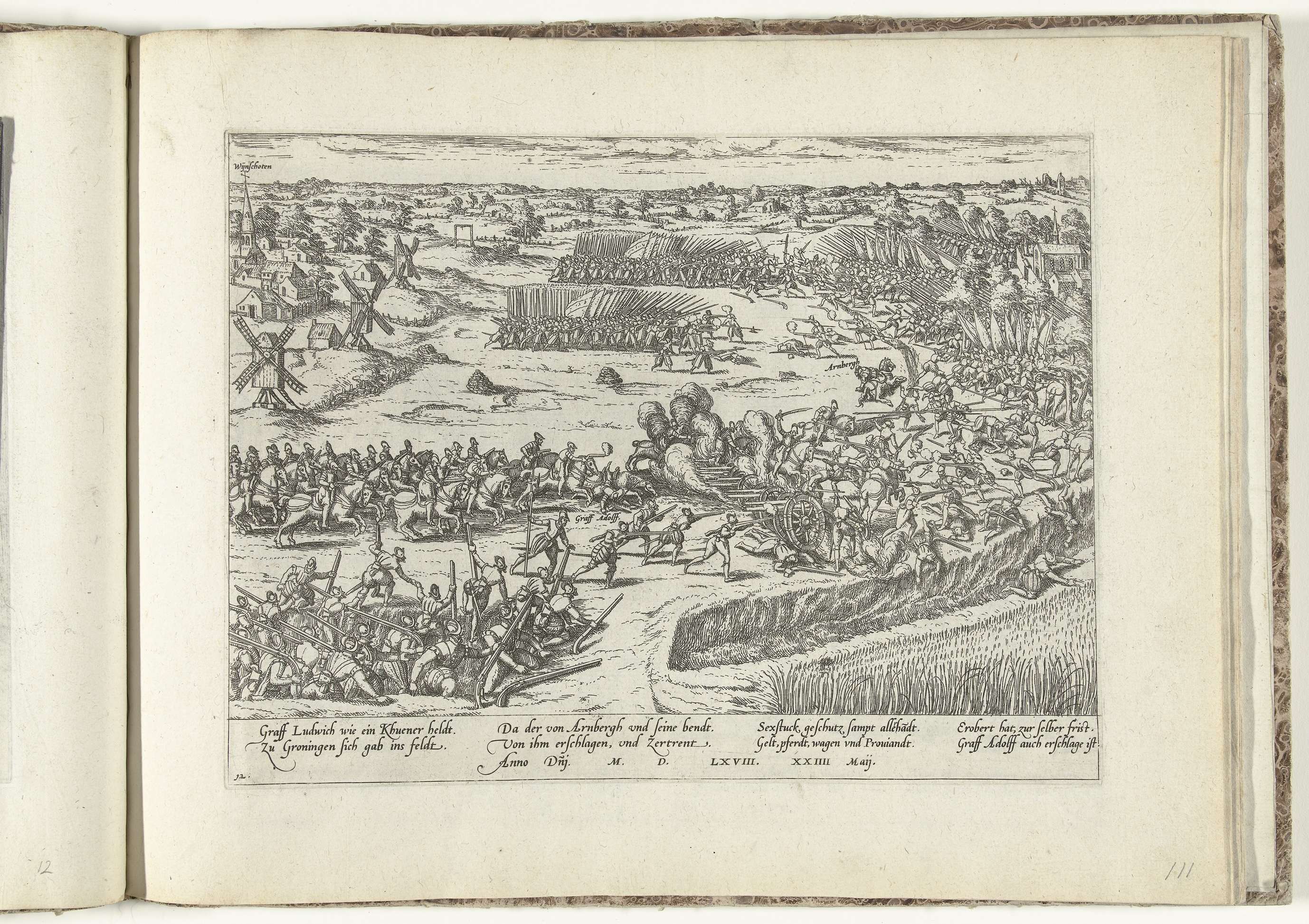 Slag bij Heiligerlee, 23 mei 1568. Gezicht op het slagveld, in het midden sneuvelt graaf Adolf, rechts de graaf van Arenberg. Met onderschrift van 8 regels in het Duits. Genummerd: 12. De prent maakt deel uit van een album.