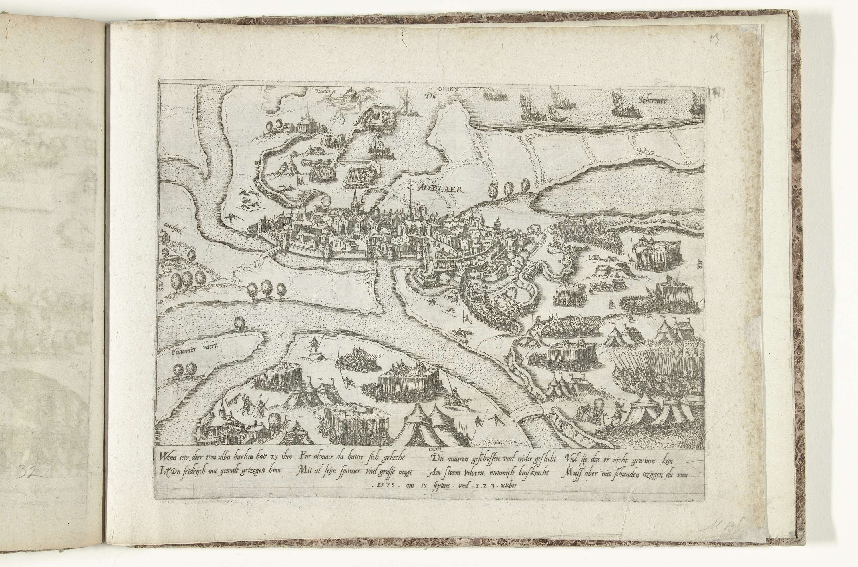 Plan van het beleg van Alkmaar, augustus en september 1573. Gezicht op de stad en het omringend gebied. Op de voorgrond de legerplaats van de belegerende troepen onder bevel van Don Frederik, bovenaan de Schermer. Met onderschrift van 2 regels in het Duits en de datum. Ongenummerd. De prent maakt deel uit van een album.