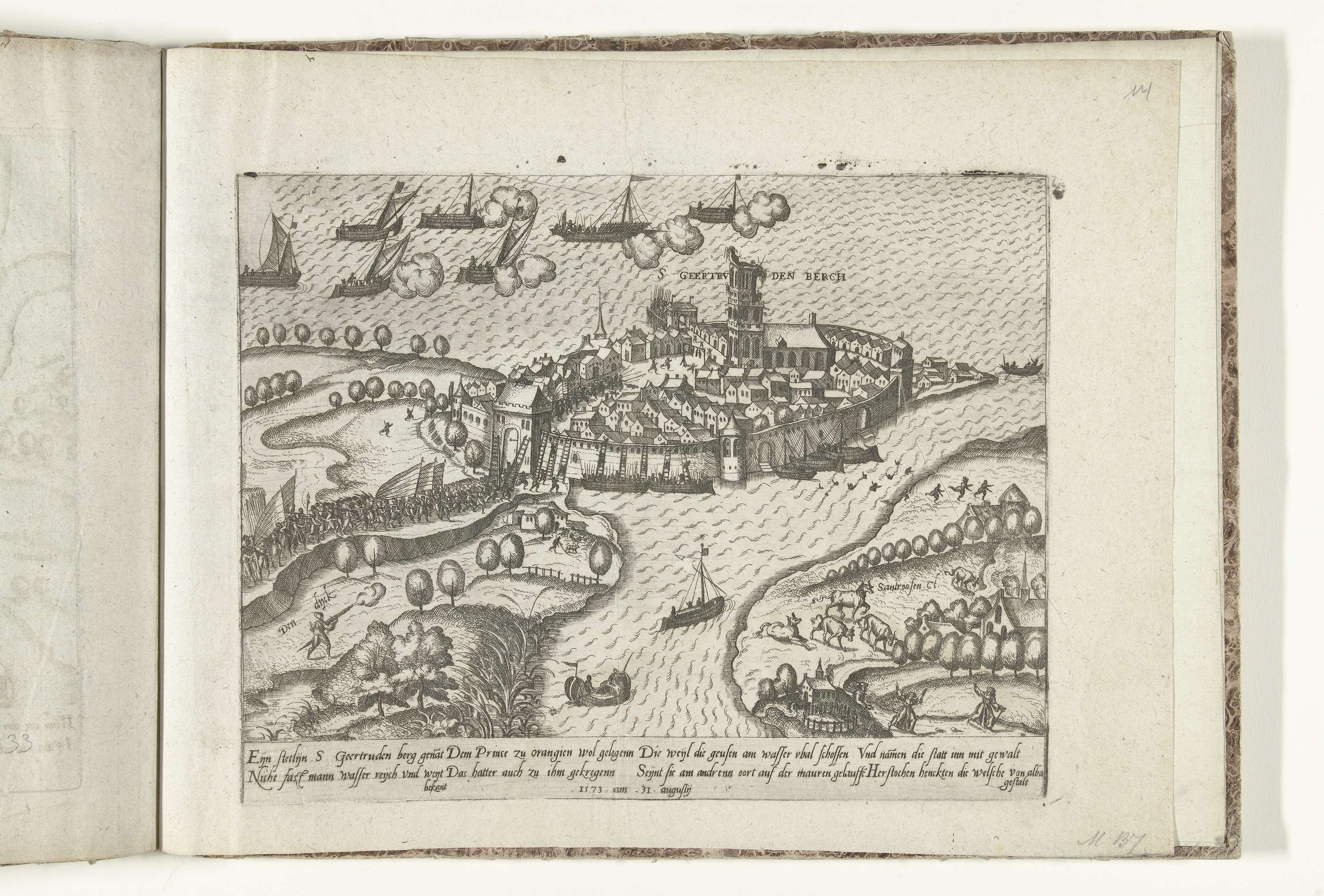 Inname van Geertruidenberg door de watergeuzen op 28 augustus 1573. Soldaten komen links aan land en bestormen met ladders de stad. Boven vuren schepen op de stad. Met onderschrift van 2 regels in het Duits en de datum. Ongenummerd. De prent maakt deel uit van een album.