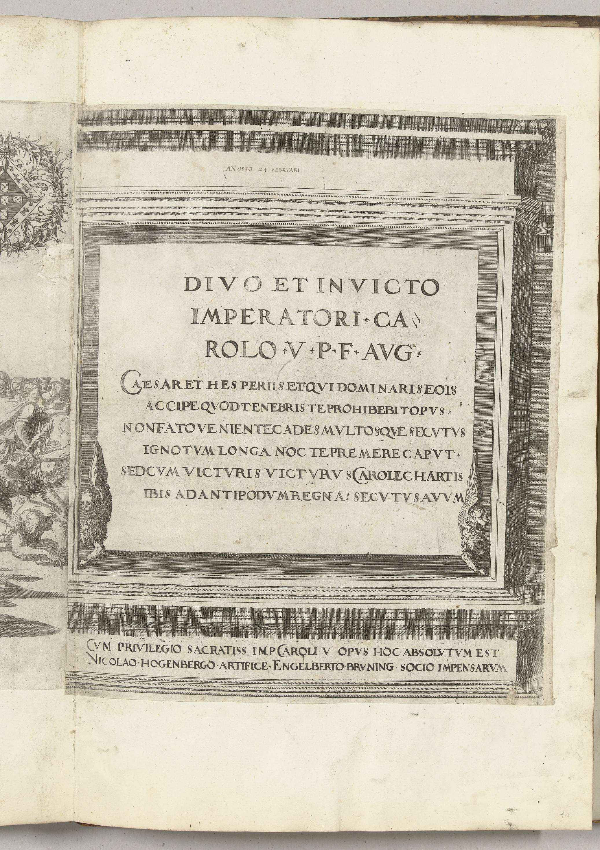 Blad met de opdracht aan Karel V. Optocht van Karel V met de paus Clemens VII te Bologna na zijn kroning to keizer, 24 februari 1530.