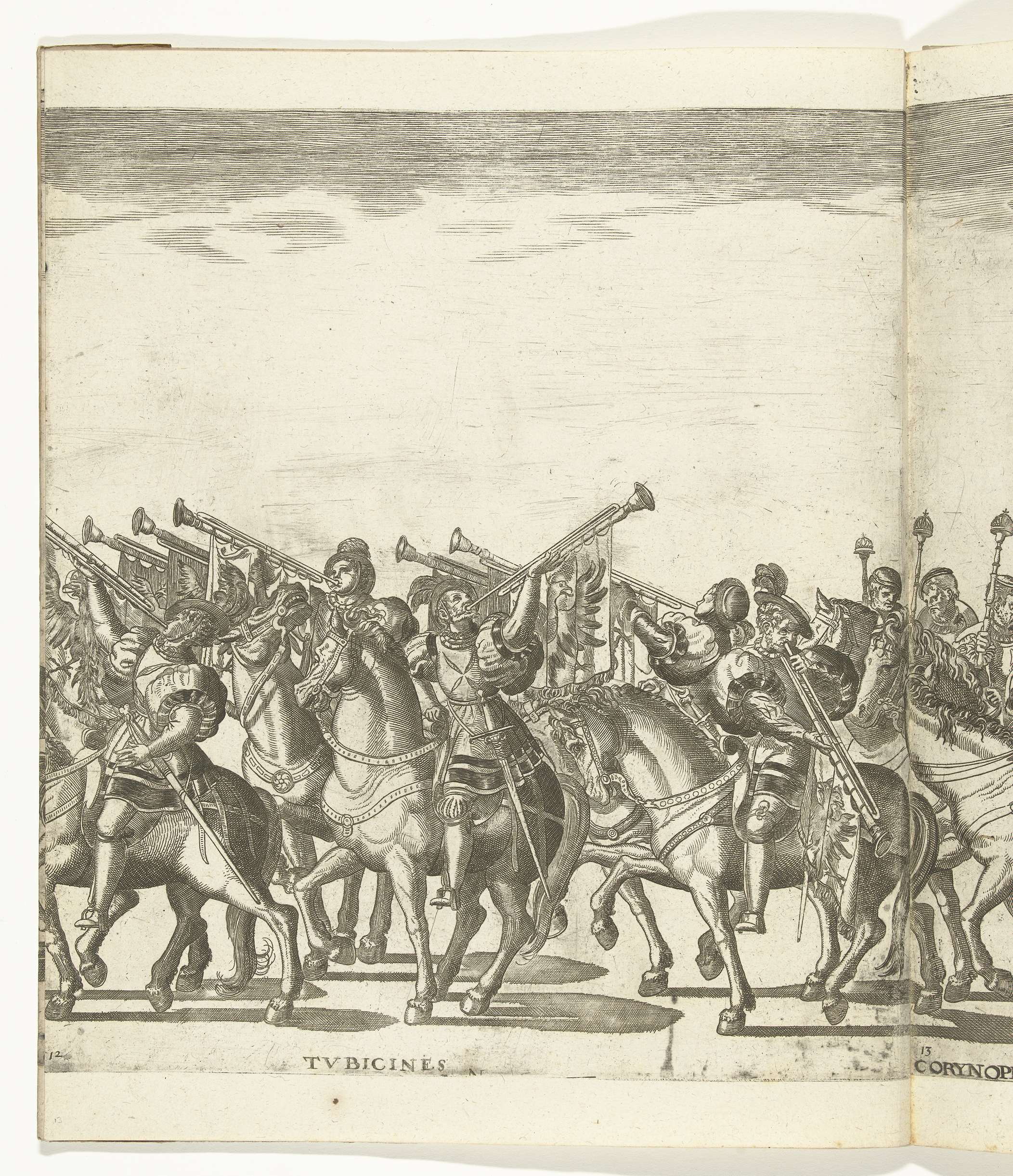 Bazuinen, plaat 12. Optocht van Karel V met de paus Clemens VII te Bologna na zijn kroning tot keizer, 24 februari 1530.