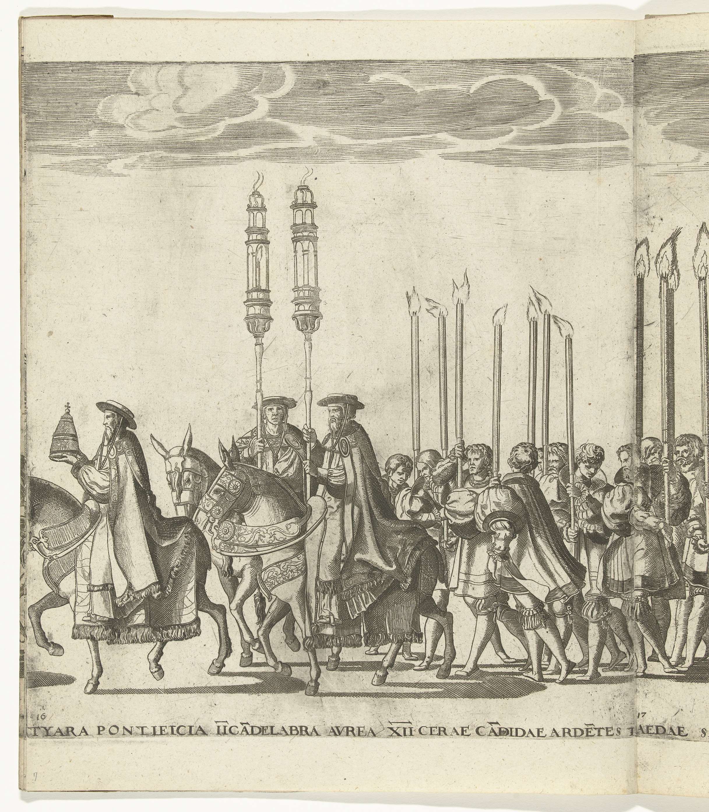 Pauselijke tiara en kandelaren, plaat 16. Optocht van Karel V met de paus Clemens VII te Bologna na zijn kroning tot keizer, 24 februari 1530.