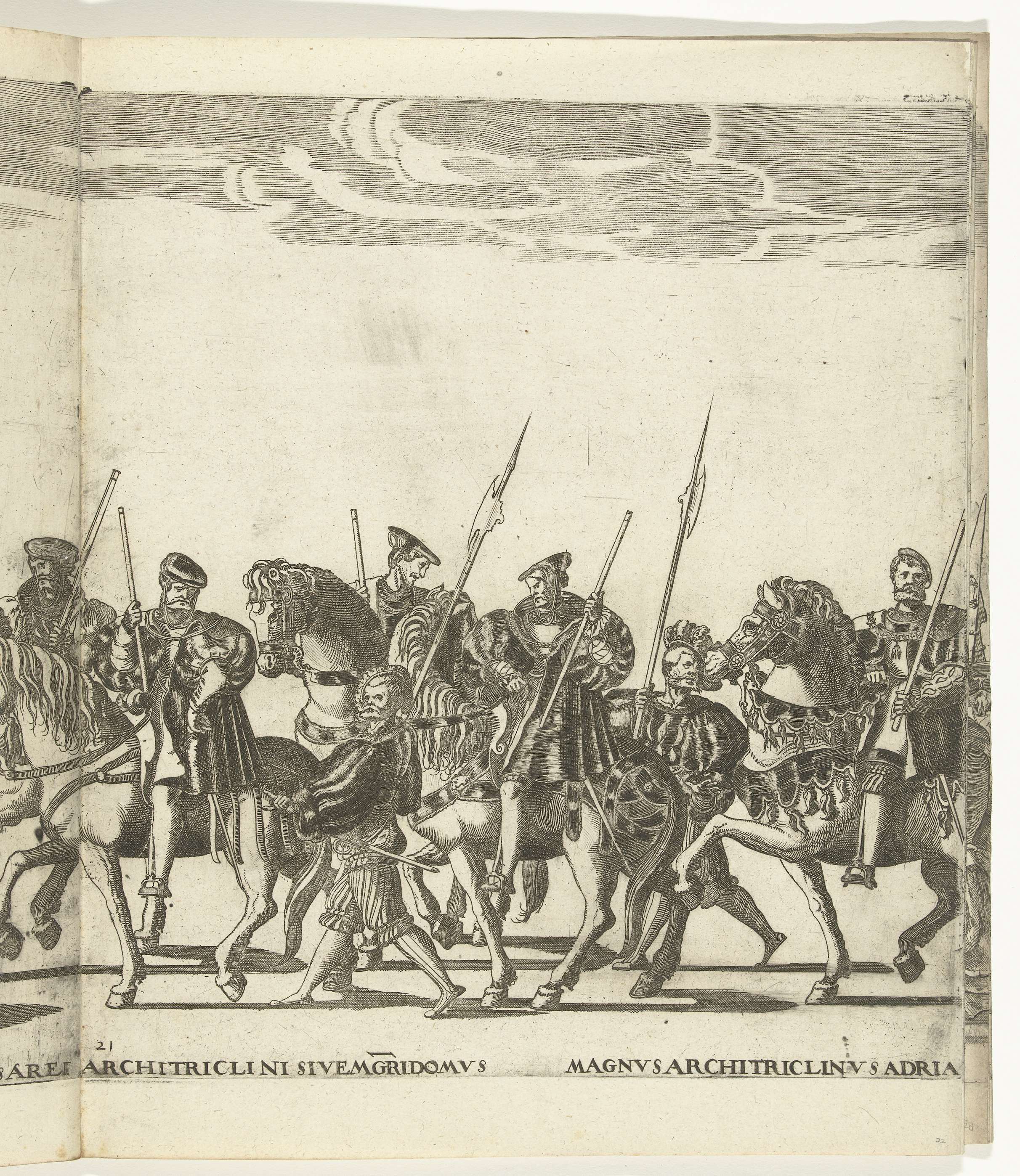 Functionarissen aan het keizerlijk hof, plaat 21. Optocht van Karel V met de paus Clemens VII te Bologna na zijn kroning tot keizer, 24 februari 1530.