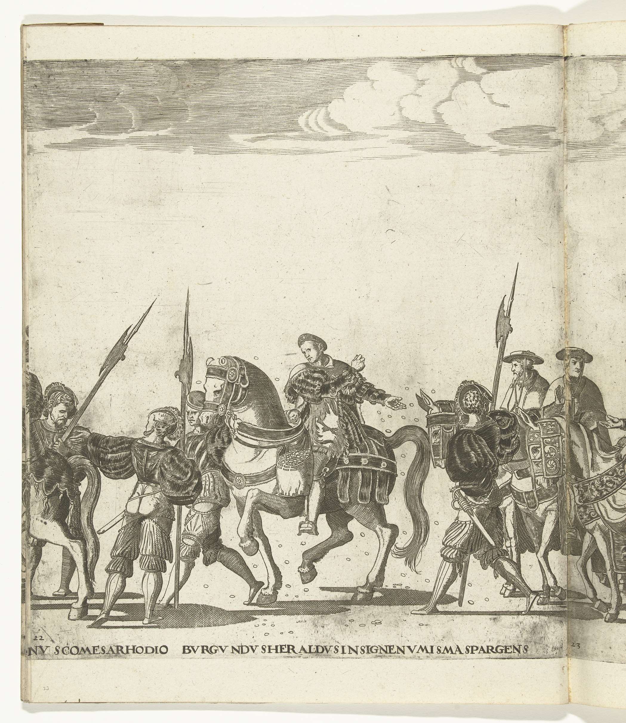 Strooien van nieuwe zilveren munten met de beeltenis van keizer Karel V, plaat 22. Optocht van Karel V met de paus Clemens VII te Bologna na zijn kroning tot keizer, 24 februari 1530.