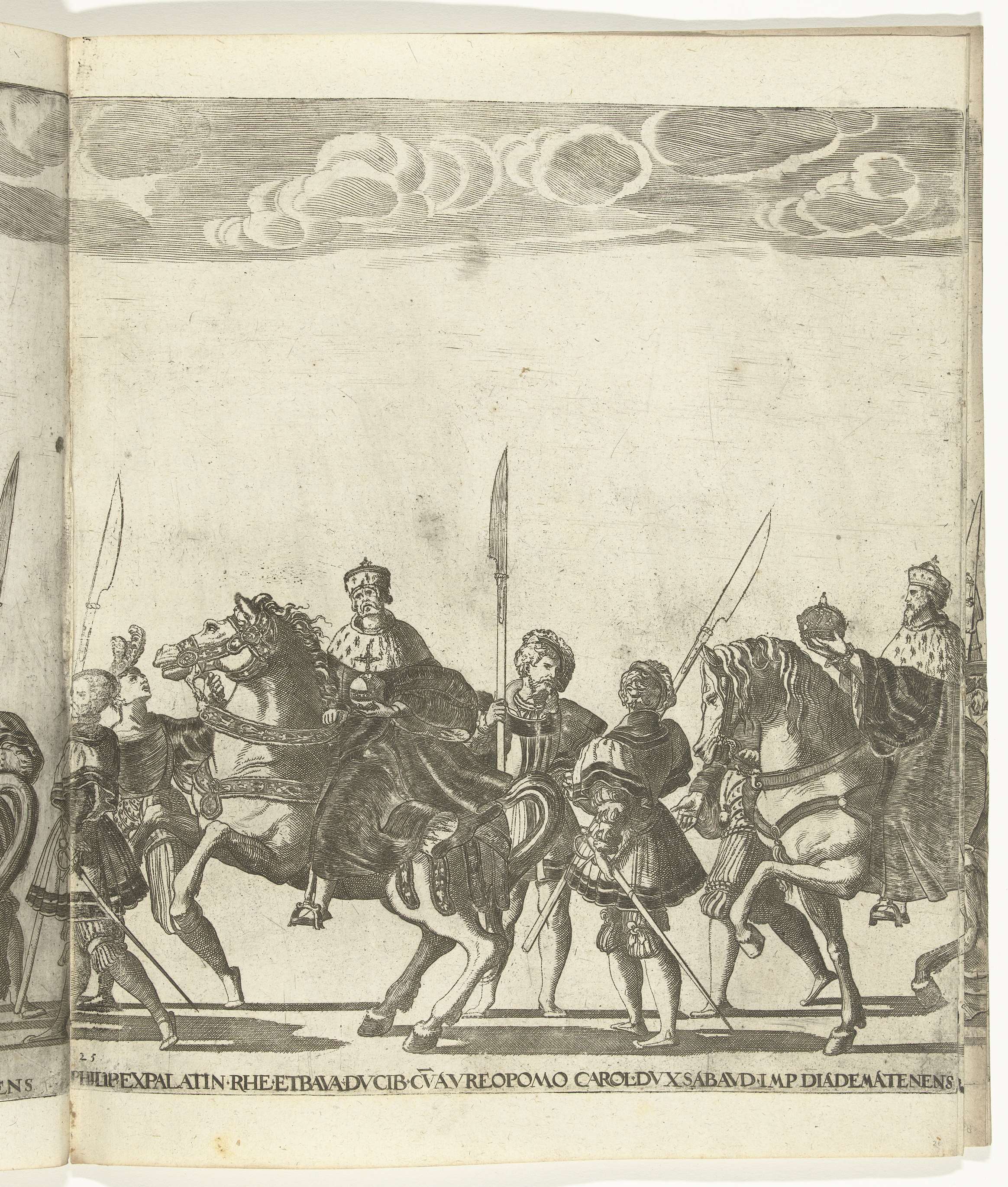 Filips, paltsgraaf en hertog van Beieren, met de rijksappel en Karel III, hertog van Savoye, met de keizerskroon, plaat 25. Optocht van Karel V met de paus Clemens VII te Bologna na zijn kroning tot keizer, 24 februari 1530.