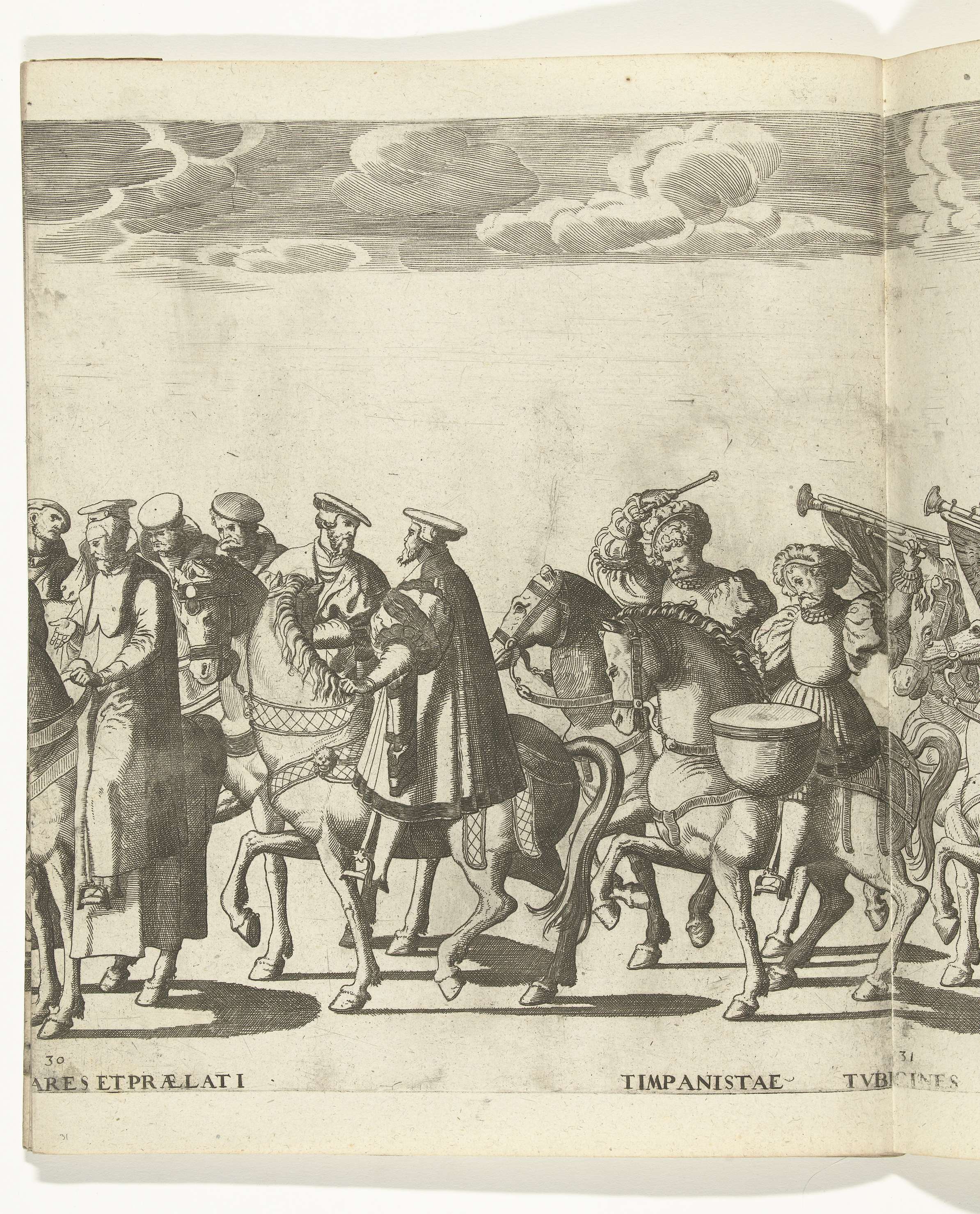 Vertegenwoordigers van de Universiteit van Bologna en twee trommelslagers, plaat 30. Optocht van Karel V met de paus Clemens VII te Bologna na zijn kroning tot keizer, 24 februari 1530.