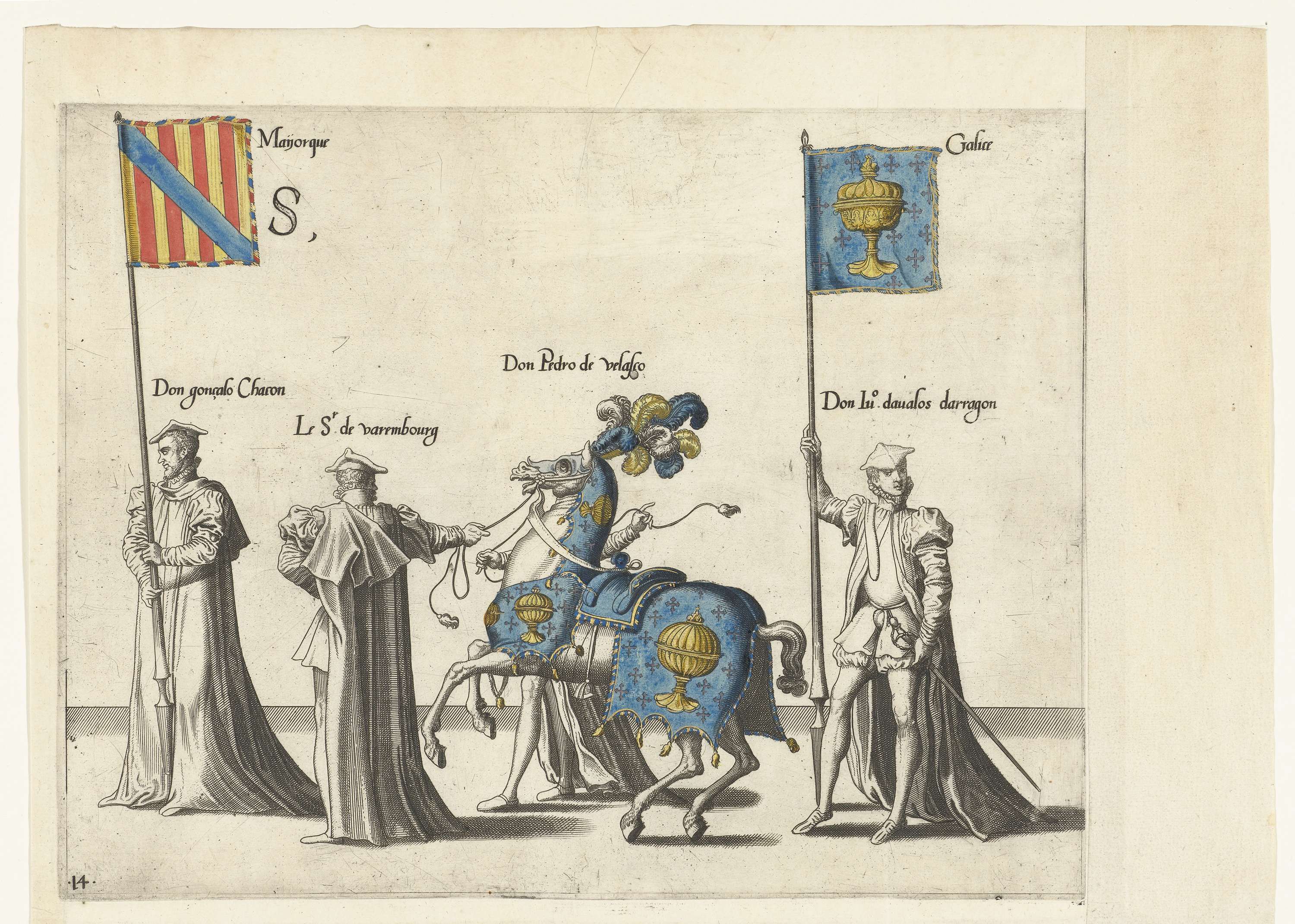 Vier deelnemers aan de optocht, paarden en de vaandels met de wapens van Mallorca en Galicië. Onderdeel van de prentreeks van de Begrafenisoptocht van keizer Karel V op 29 december 1558 te Brussel.