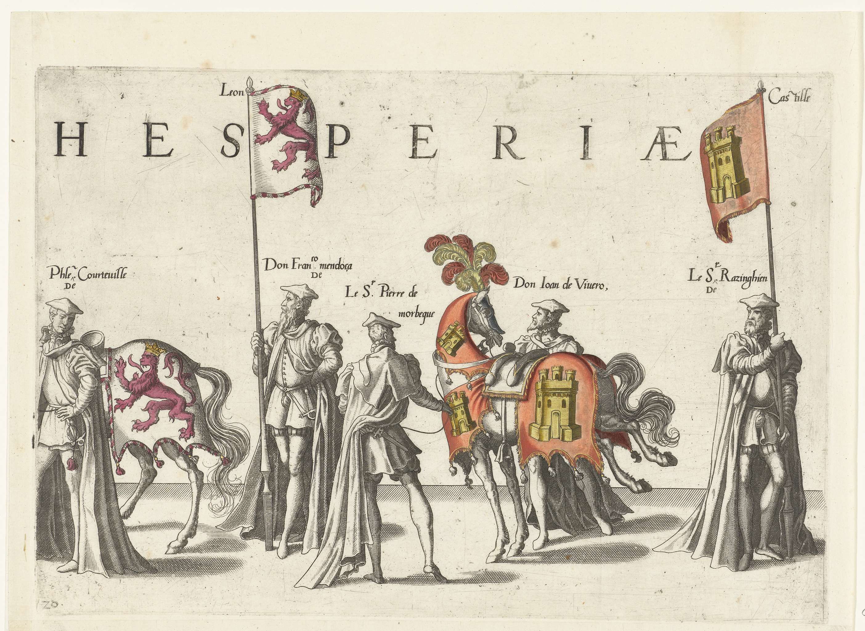 Vijf deelnemers aan de optocht, paarden en de vaandels met de wapens van Castilla en León. Onderdeel van de prentreeks van de Begrafenisoptocht van keizer Karel V op 29 december 1558 te Brussel.