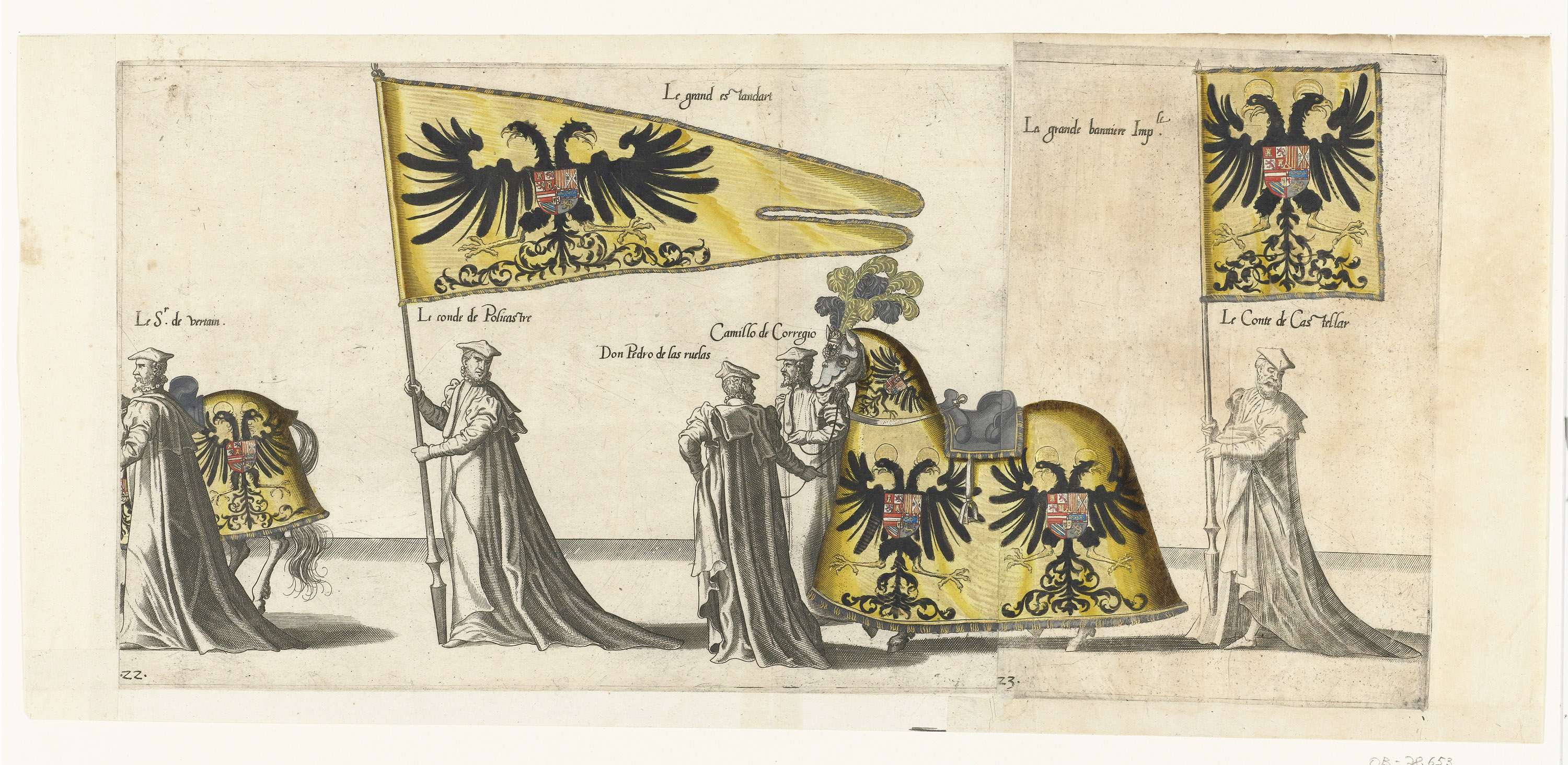 Vier deelnemers aan de optocht, paarden en een keizerlijke vaandel en een deelnemer aan de optocht met het grote keizerlijke banier. Onderdeel van de prentreeks van de Begrafenisoptocht van keizer Karel V op 29 december 1558 te Brussel. Prent nr. 22 en prent nr. 23 aan elkaar geplakt.