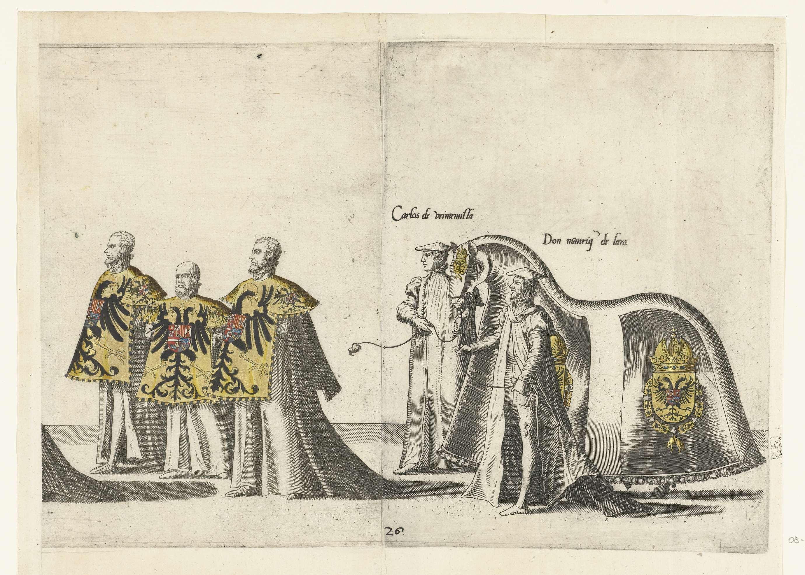 Vijf deelnemers aan de optocht en een paard versierd met het keizerlijke wapen. Onderdeel van de prentreeks van de Begrafenisoptocht van keizer Karel V op 29 december 1558 te Brussel. Deel van prent nr. 25 en prent nr. 26 aan elkaar geplakt.