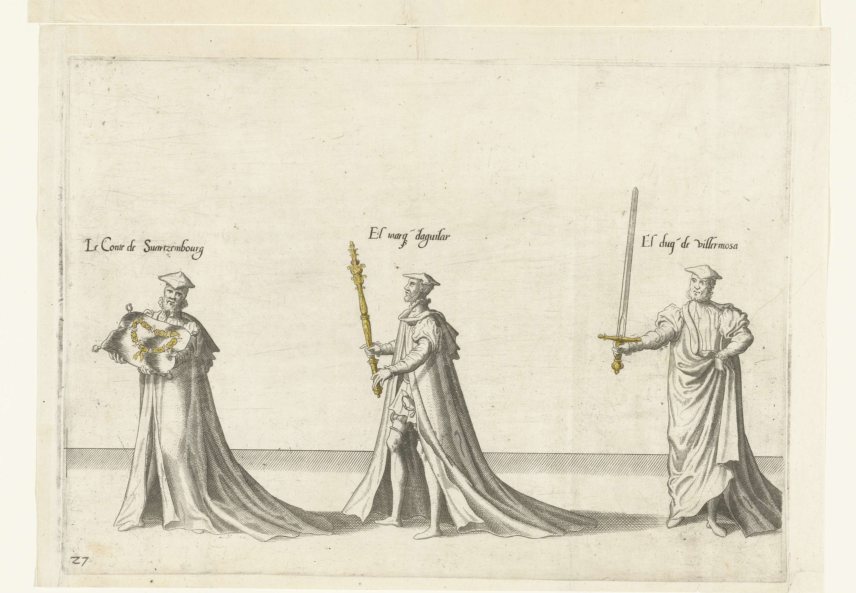 Drie deelnemers aan de optocht, met zich meedragend de ketting met de orde van het Gulden Vlies, de scepter en het zwaard. Onderdeel van de prentreeks van de Begrafenisoptocht van keizer Karel V op 29 december 1558 te Brussel.