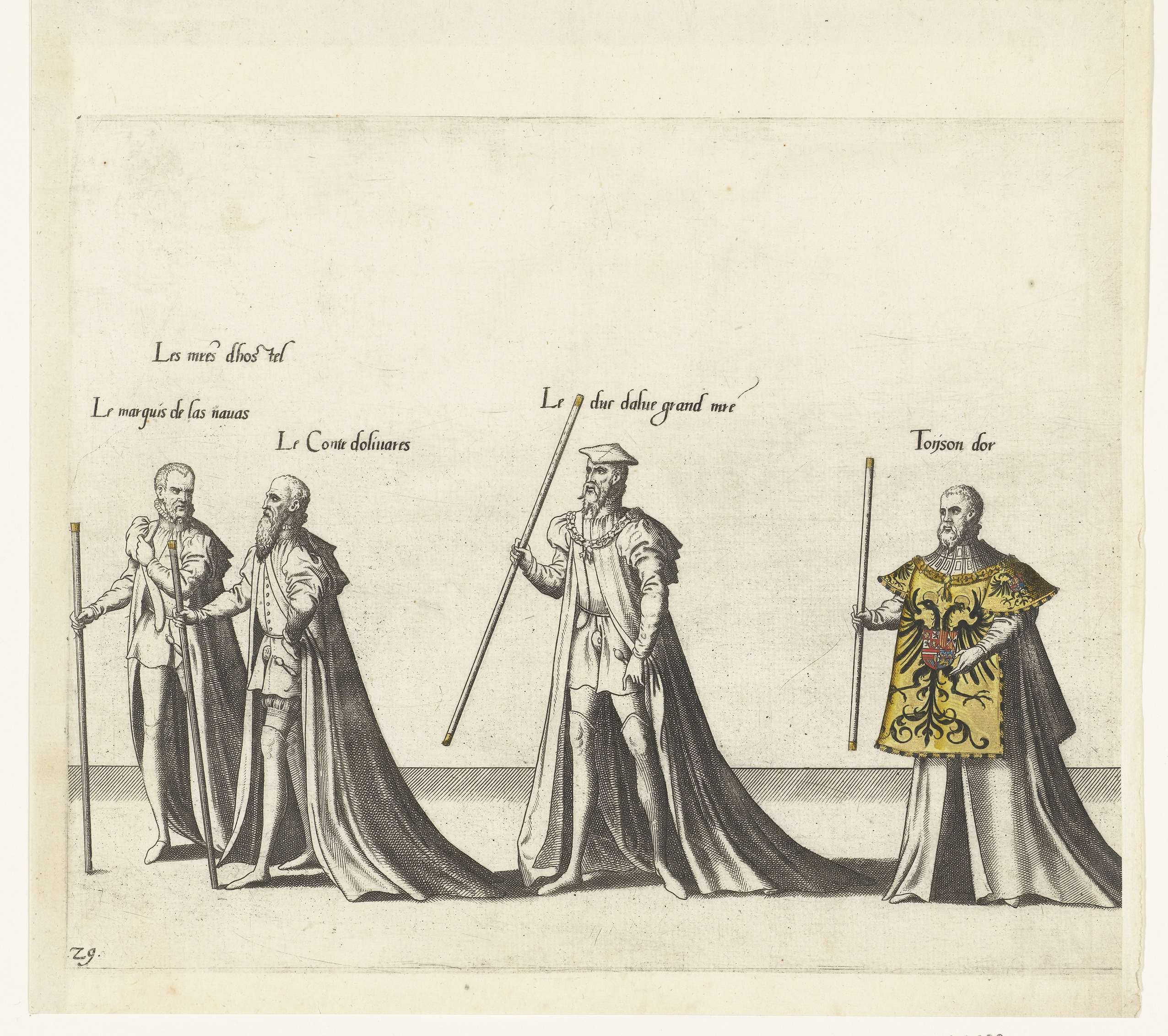 Vier edelen die deelnemen aan de optocht, waaronder de hertog van Alva. Onderdeel van de prentreeks van de Begrafenisoptocht van keizer Karel V op 29 december 1558 te Brussel. Rechts is een strook met één persoon afgesneden.