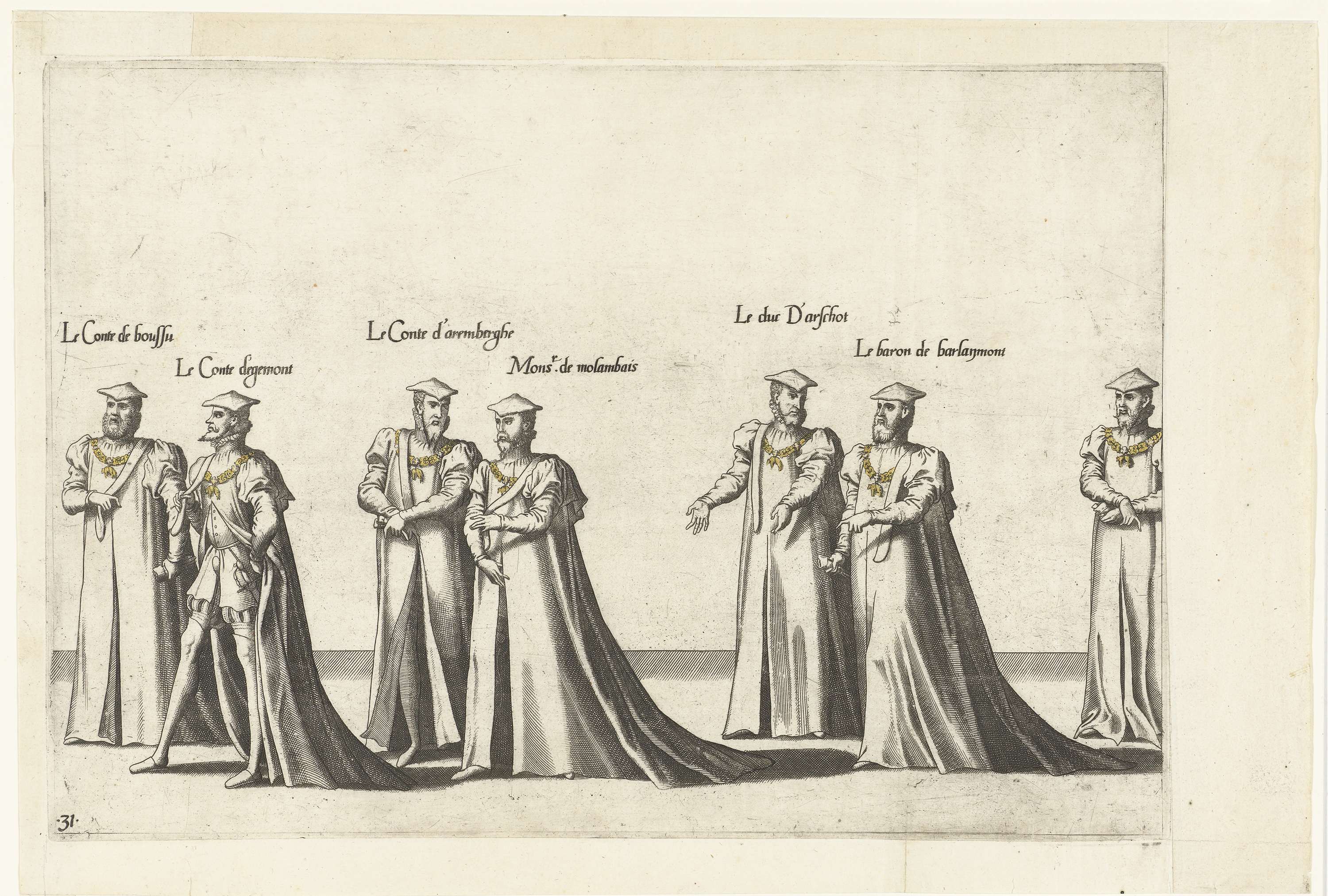 Zeven vliesridders die deelnemen aan de optocht. Onderdeel van de prentreeks van de Begrafenisoptocht van keizer Karel V op 29 december 1558 te Brussel.
