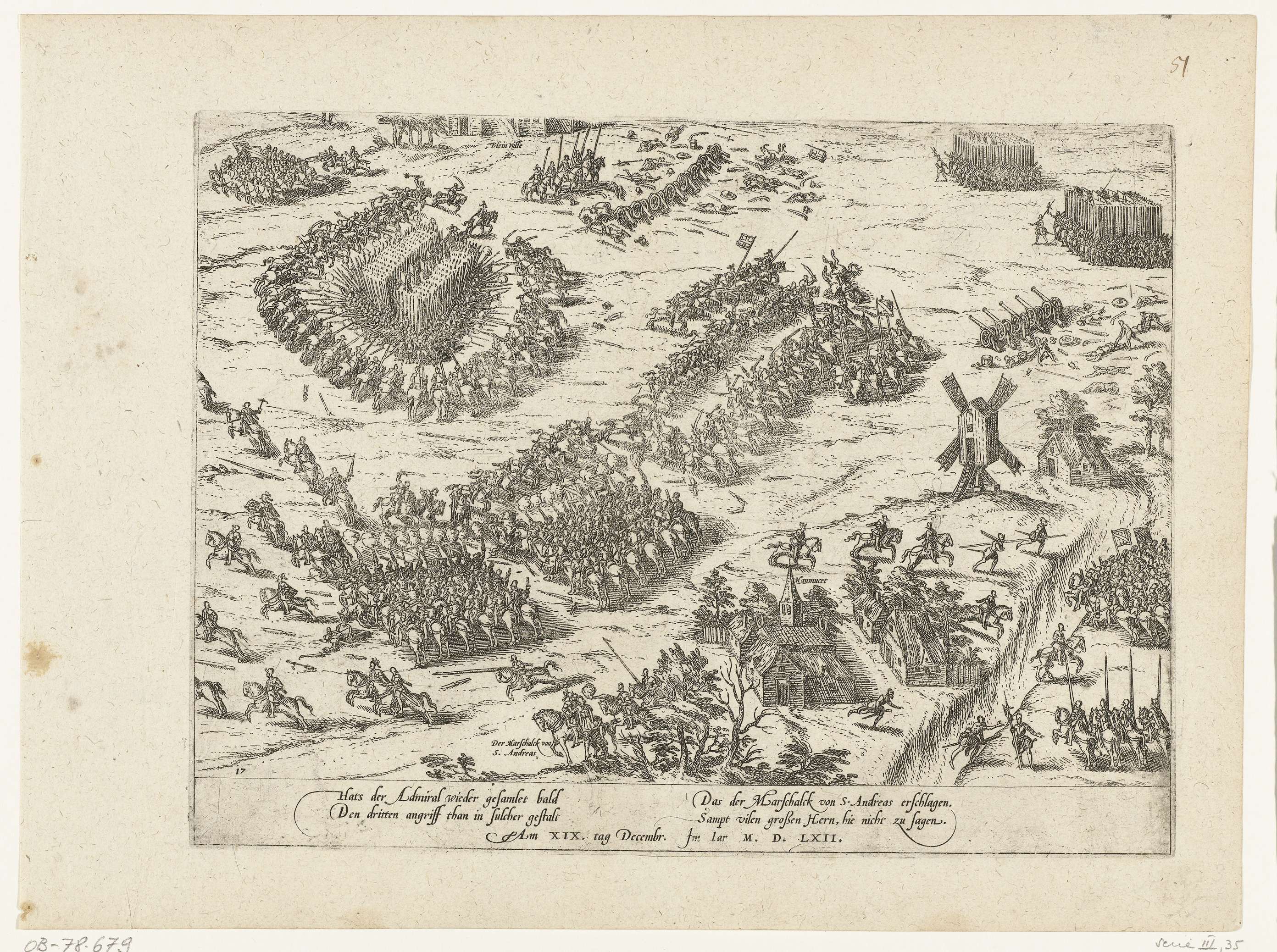 Slag bij Dreux tussen de hugenoten en de katholieken, derde aanval, 19 december 1562. Gezicht op het slagveld. Met onderschrift van 8 regels in het Duits. Genummerd: 17. Blad afkomstig uit een album dat uit elkaar is gehaald. Rechtsboven genummerd (in pen): 51.