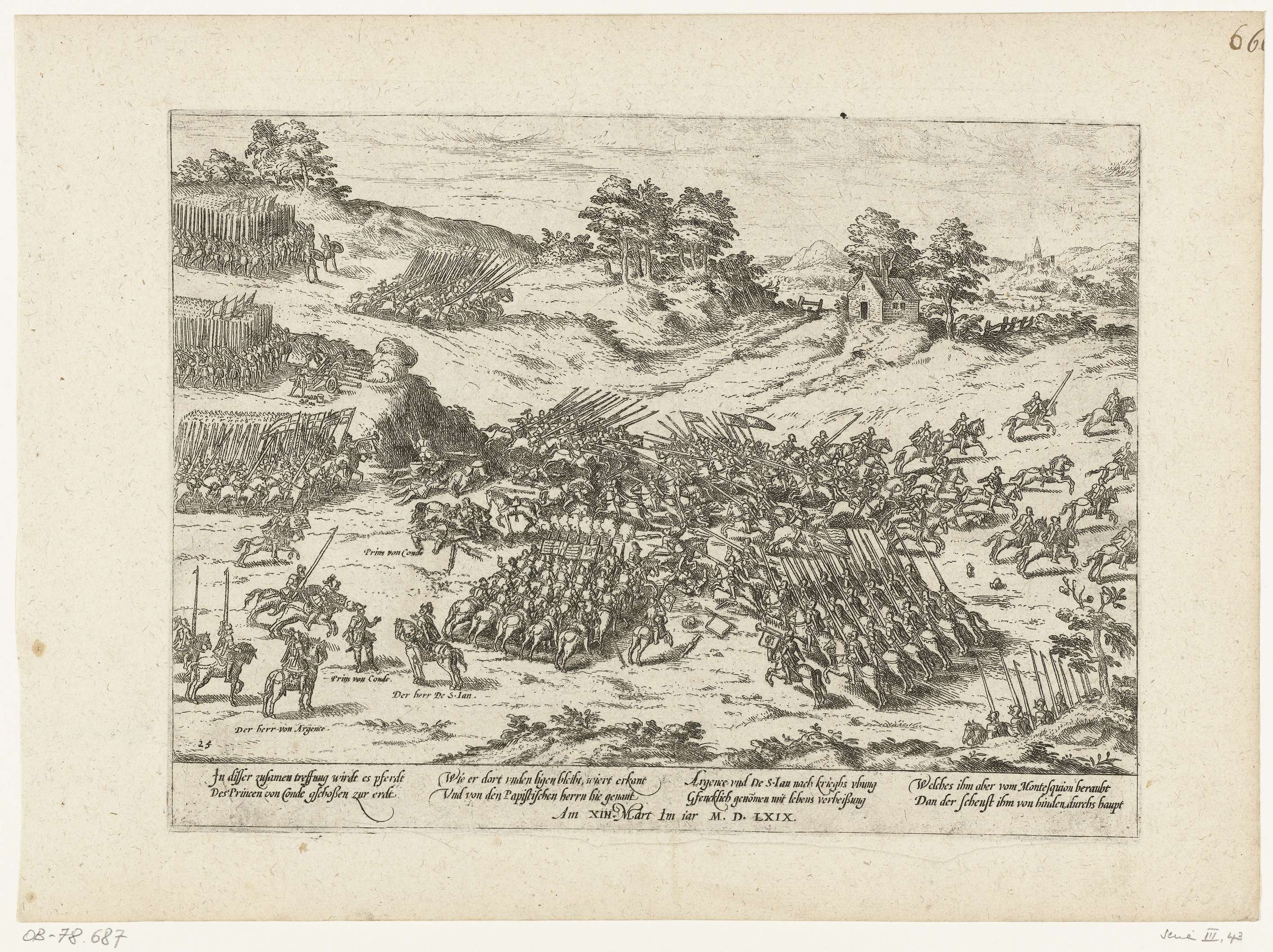 Prins van Condé gevangengenomen en vermoord tijdens de slag bij Jarnac, 13 maart 1569. Gezicht op het slagveld. Met onderschrift van 8 regels in het Duits. Genummerd: 25. Blad afkomstig uit een album dat uit elkaar is gehaald. Rechtsboven genummerd (in pen): 66.