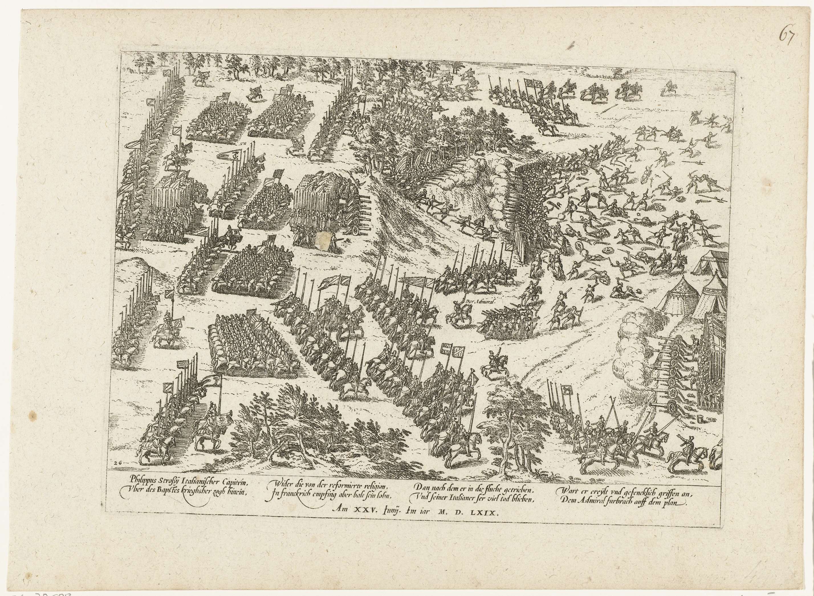Gevangenneming van de Italiaanse katholieke legeraanvoerder Filippo Strozzi in Frankrijk, 25 juni 1569. Gezicht op het slagveld. Met onderschrift van 8 regels in het Duits. Genummerd: 26. Blad afkomstig uit een album dat uit elkaar is gehaald. Rechtsboven genummerd (in pen): 67.