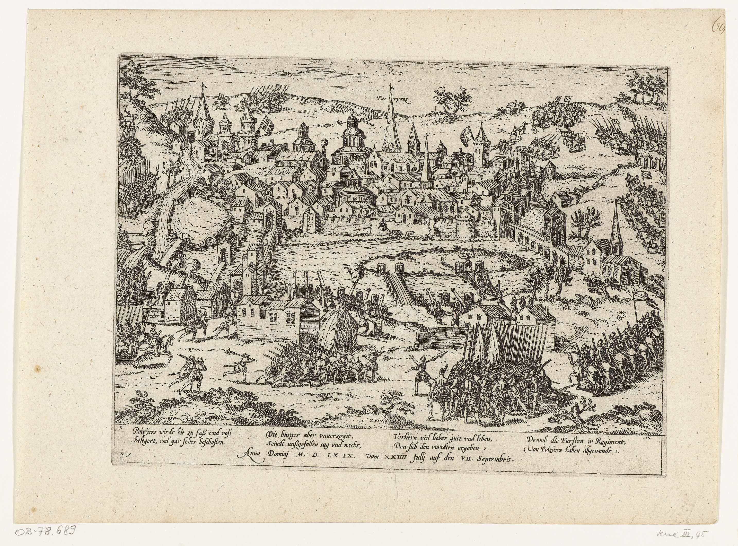 Beleg van Poitiers, 24 juli tot 7 september 1569. Gezicht op de belegerde stad. Met onderschrift van 8 regels in het Duits. Genummerd: 27. Blad afkomstig uit een album dat uit elkaar is gehaald. Rechtsboven genummerd (in pen): 68.