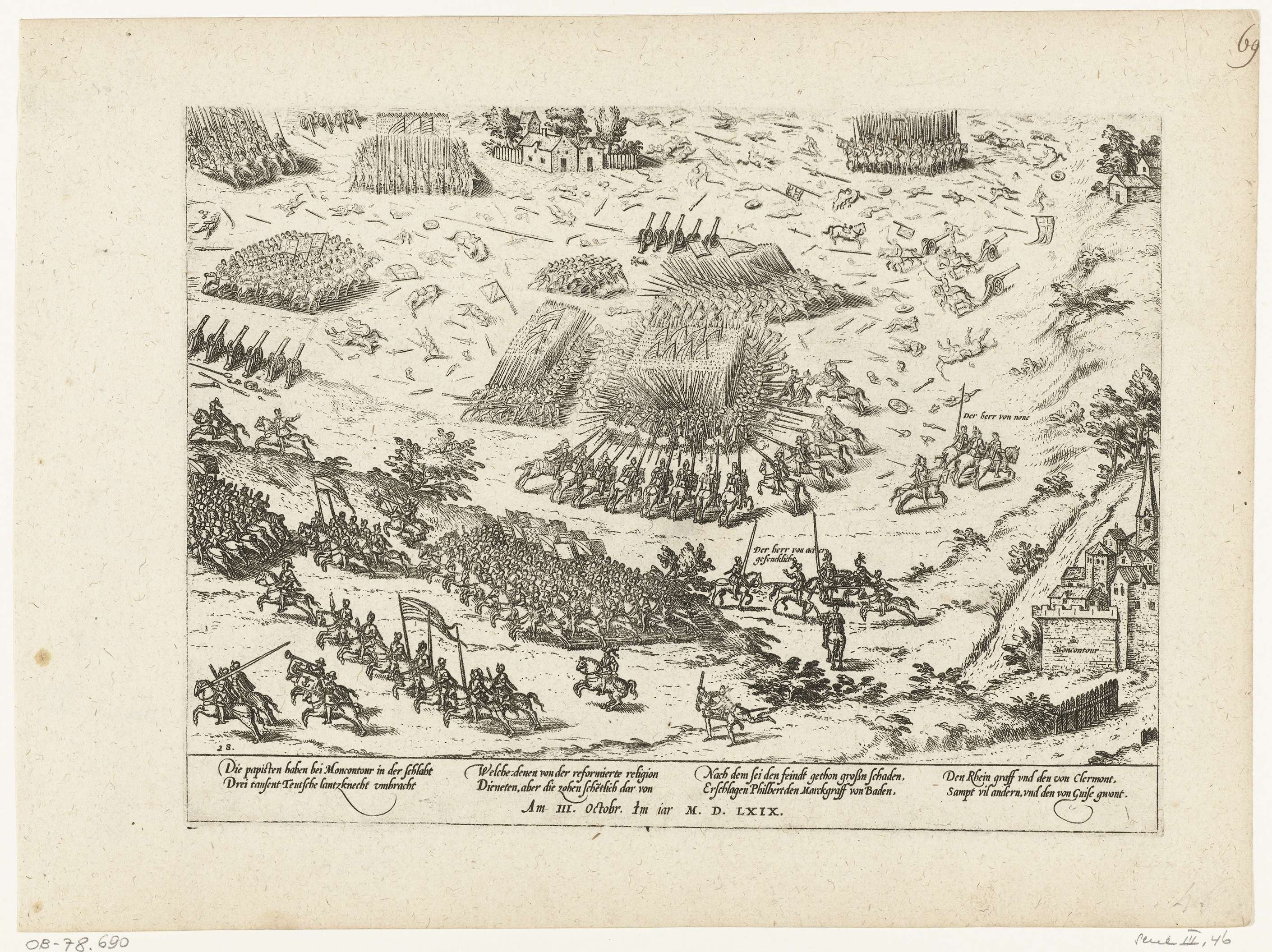 Slag bij Moncontour, 3 oktober 1569. Gezicht op het slagveld. Met onderschrift van 8 regels in het Duits. Genummerd: 28. Blad afkomstig uit een album dat uit elkaar is gehaald. Rechtsboven genummerd (in pen): 69.