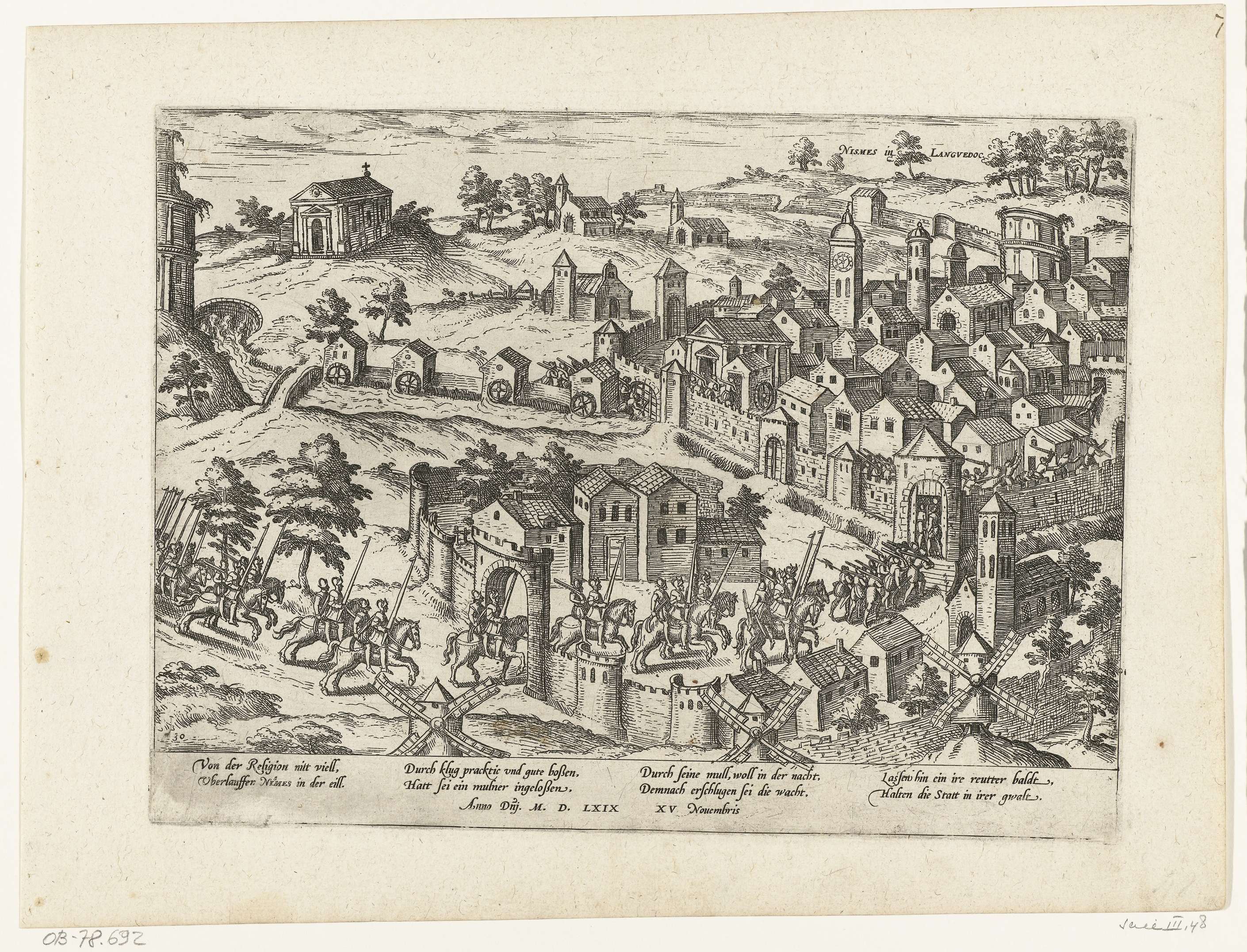 Nîmes door de hugenoten verrast, 15 november 1569. Protestantse troepen nemen de stad in. Met onderschrift van 8 regels in het Duits. Genummerd: 30. Blad afkomstig uit een album dat uit elkaar is gehaald. Rechtsboven genummerd (in pen): 7(1).