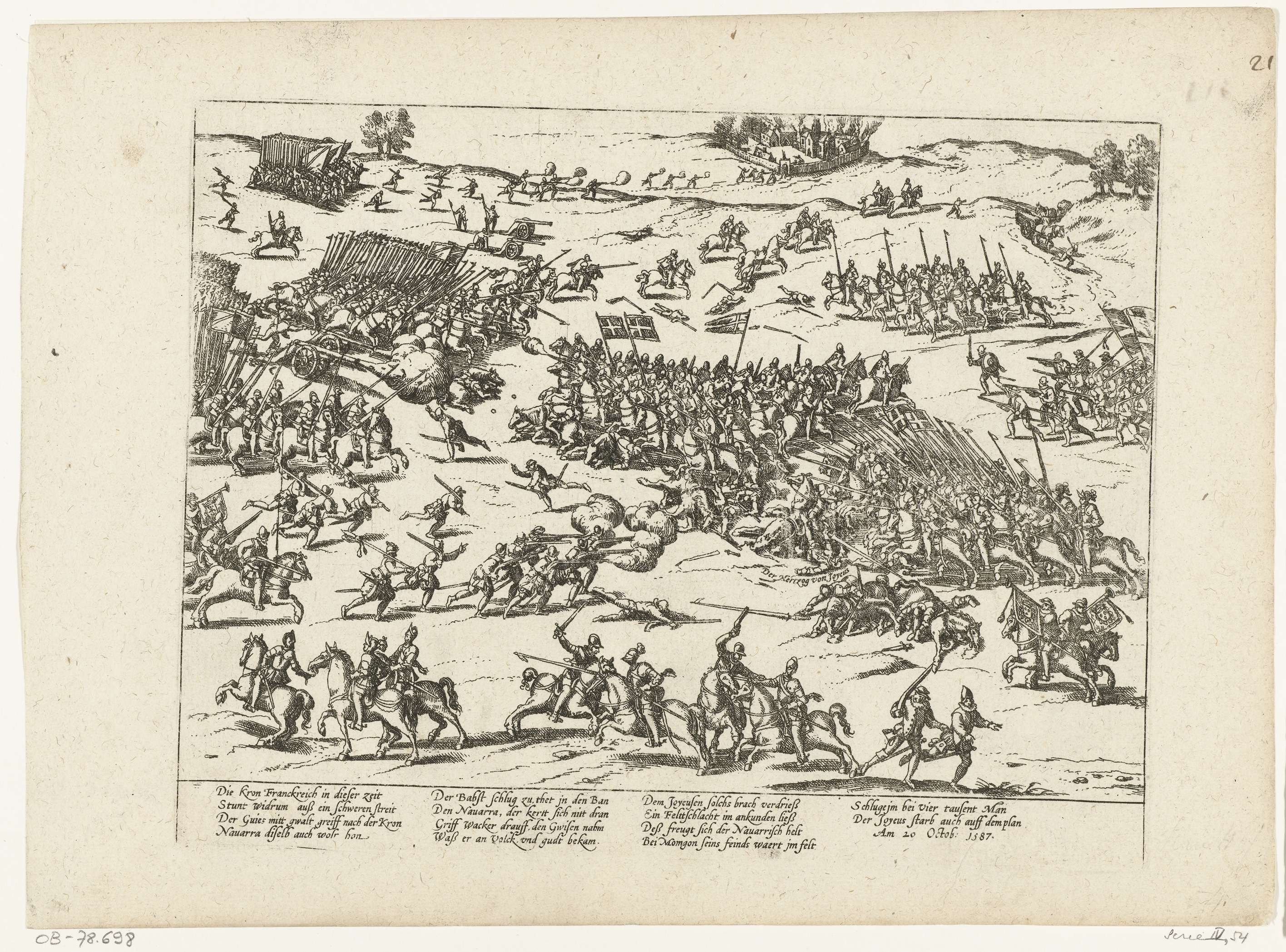 Overwinning van koning Hendrik IV van Navarra bij Montjoie, 20 oktober 1587. Gezicht op de veldslag. Met onderschrift van 14 regels in het Duits. Ongenummerd. Blad afkomstig uit een album dat uit elkaar is gehaald. Rechtsboven genummerd (in pen): 21(.).