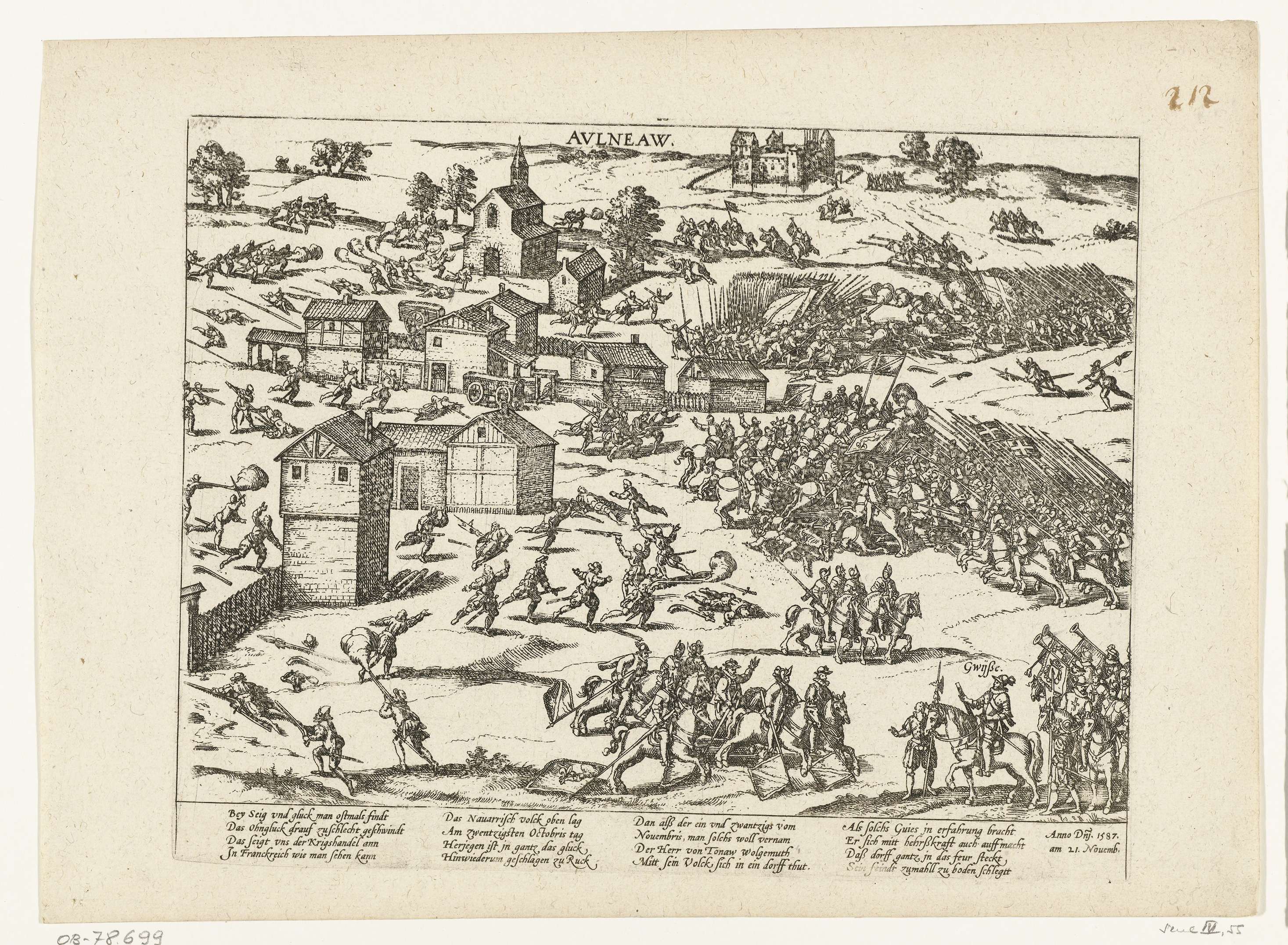 Veldslag bij Auneau, 21 november 1587. Op de voorgrond de hertog de Guise. Met onderschrift van 16 regels in het Duits. Ongenummerd. Blad afkomstig uit een album dat uit elkaar is gehaald. Rechtsboven genummerd (in pen): 212.