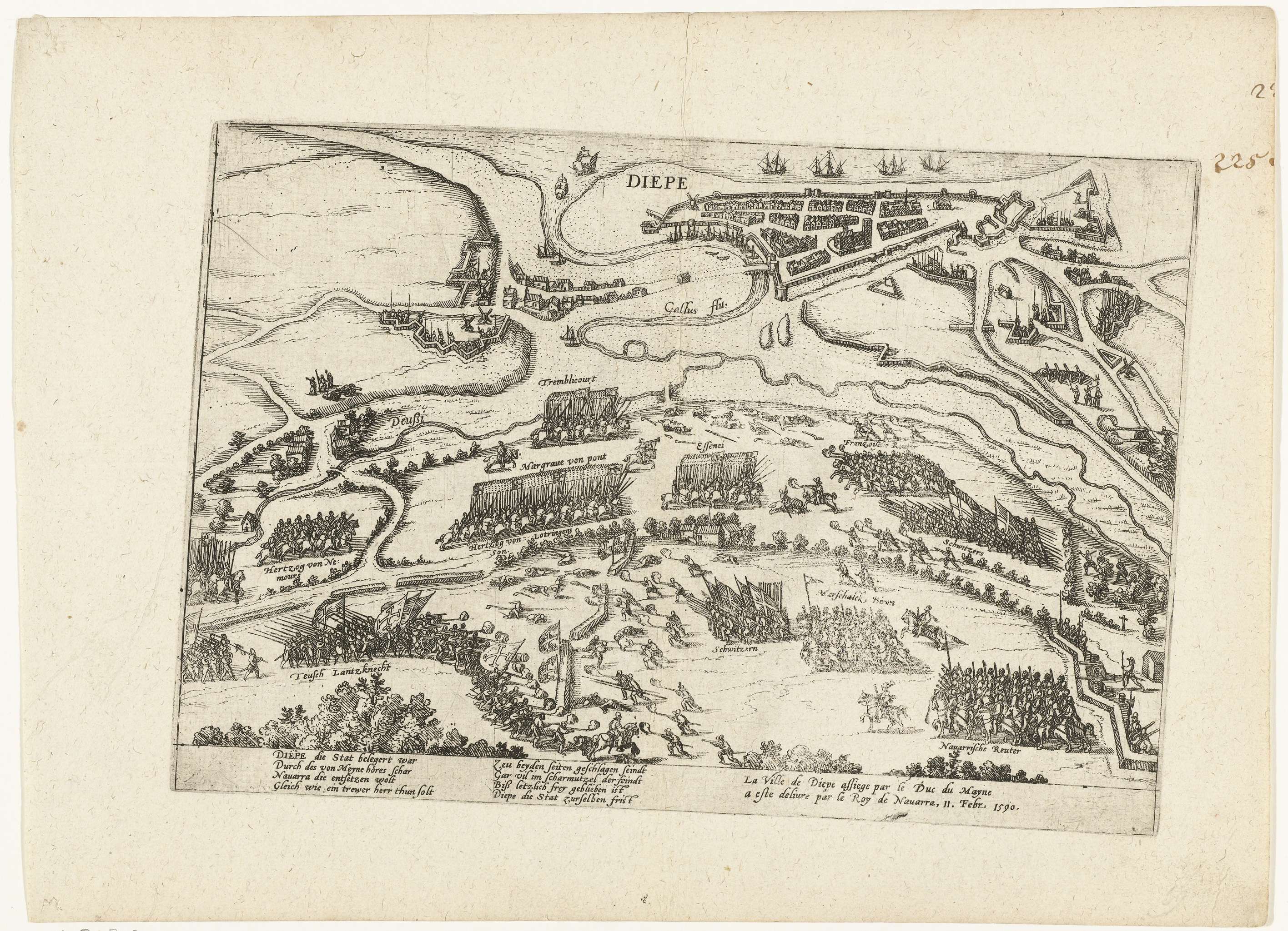 Het belegerde Dieppe ontzet door Hendrik IV, 11 februari 1590. De veldslag op de voorgrond, in de verte een plattegrond van de stad Dieppe in vogelvluchtperspectief. Met onderschrift van 8 regels in het Duits en 2 regels in het Frans. Ongenummerd. Blad afkomstig uit een album dat uit elkaar is gehaald. Rechtsboven genummerd (in pen): ...