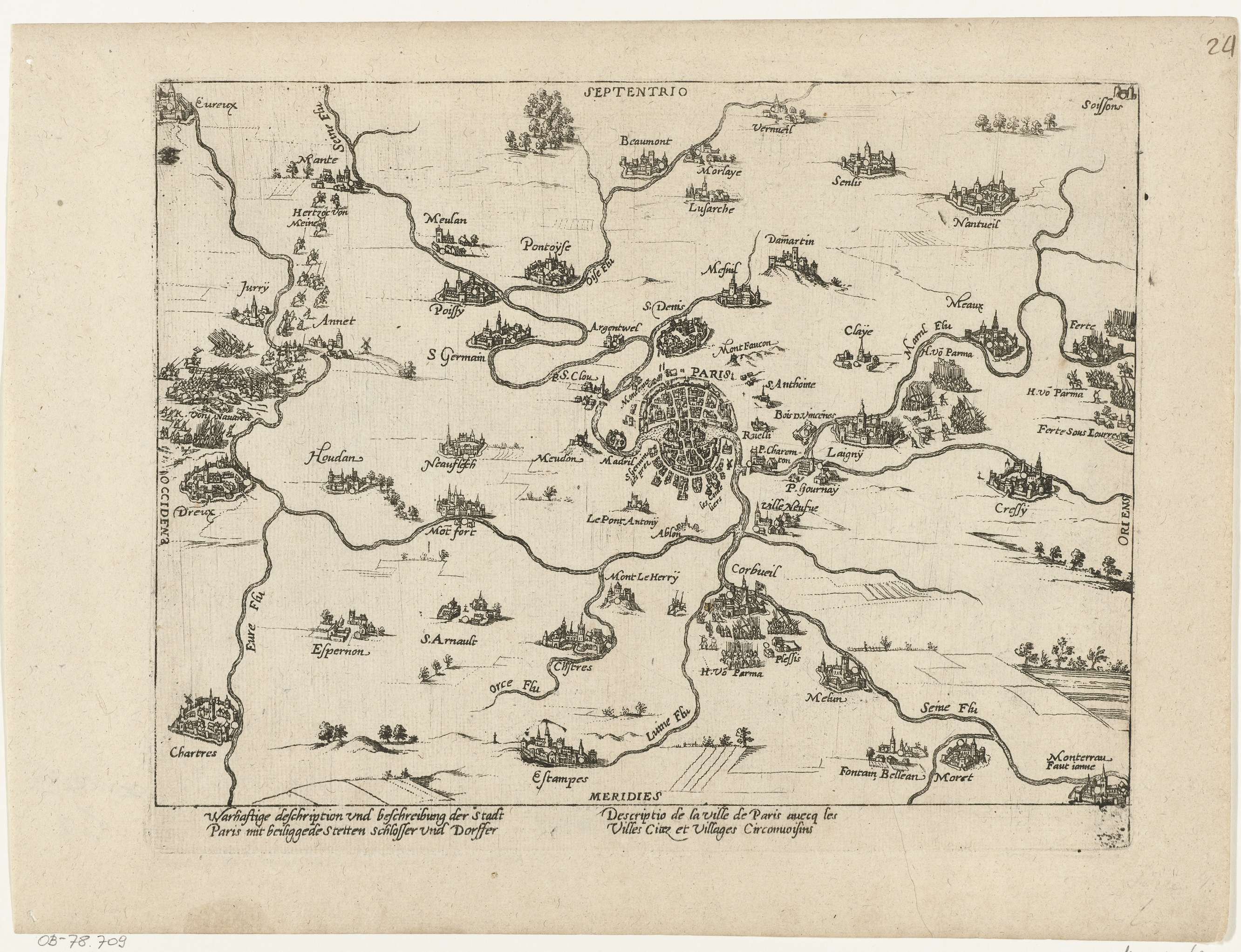 Kaart van Parijs en omgeving met de ligging van de troepen van Hendrik IV en de hertog van Parma, 1590. Met onderschrift van 2 regels in het Duits en 2 regels in het Frans. Ongenummerd. Blad afkomstig uit een album dat uit elkaar is gehaald. Rechtsboven genummerd (in pen): 24.