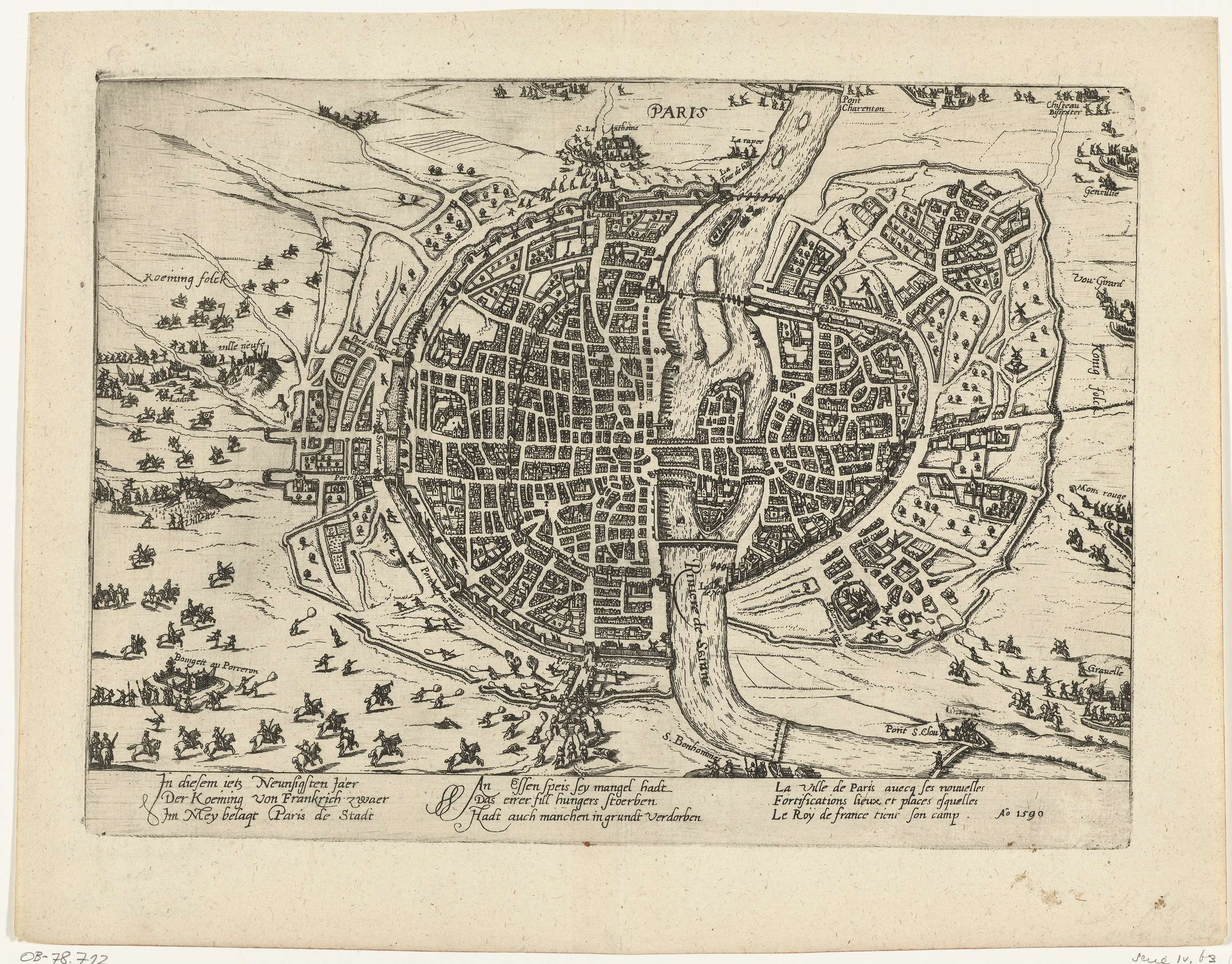 Parijs belegerd door koning Hendrik IV en ontzet door de hertog van Parma, 19 augustus 1590. Plattegrond van de stad Parijs met de ligging van de troepen van Hendrik IV en de hertog van Parma. Met onderschrift van 6 regels in het Duits en 3 regels in het Frans. Ongenummerd. Kopie of herhaling naar de ...