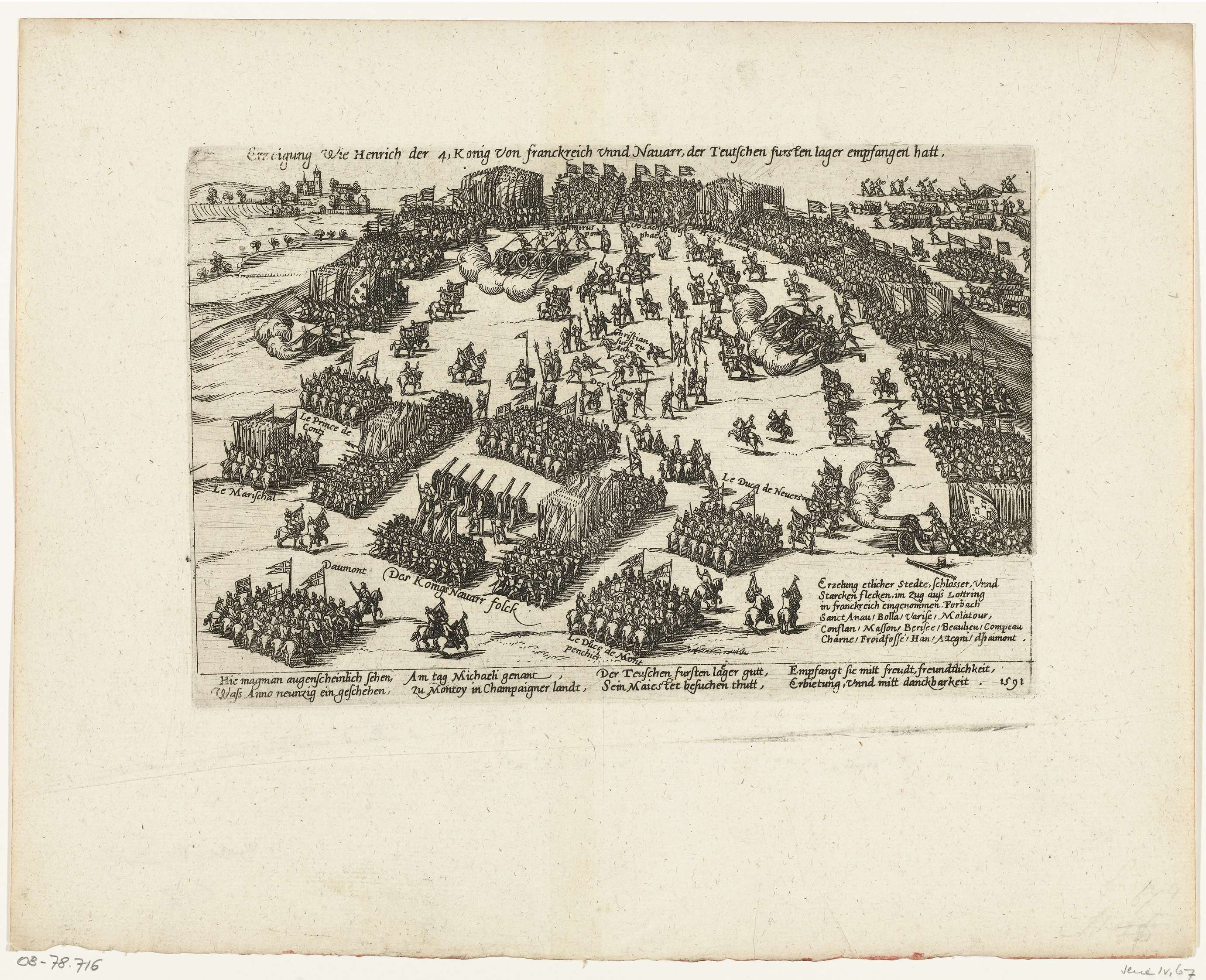 Ontvangst van Hendrik IV en zijn troepen bij het Duitse leger, 1591. Met onderschrift van 8 regels in het Duits. Ongenummerd. Papier met rode randjes.