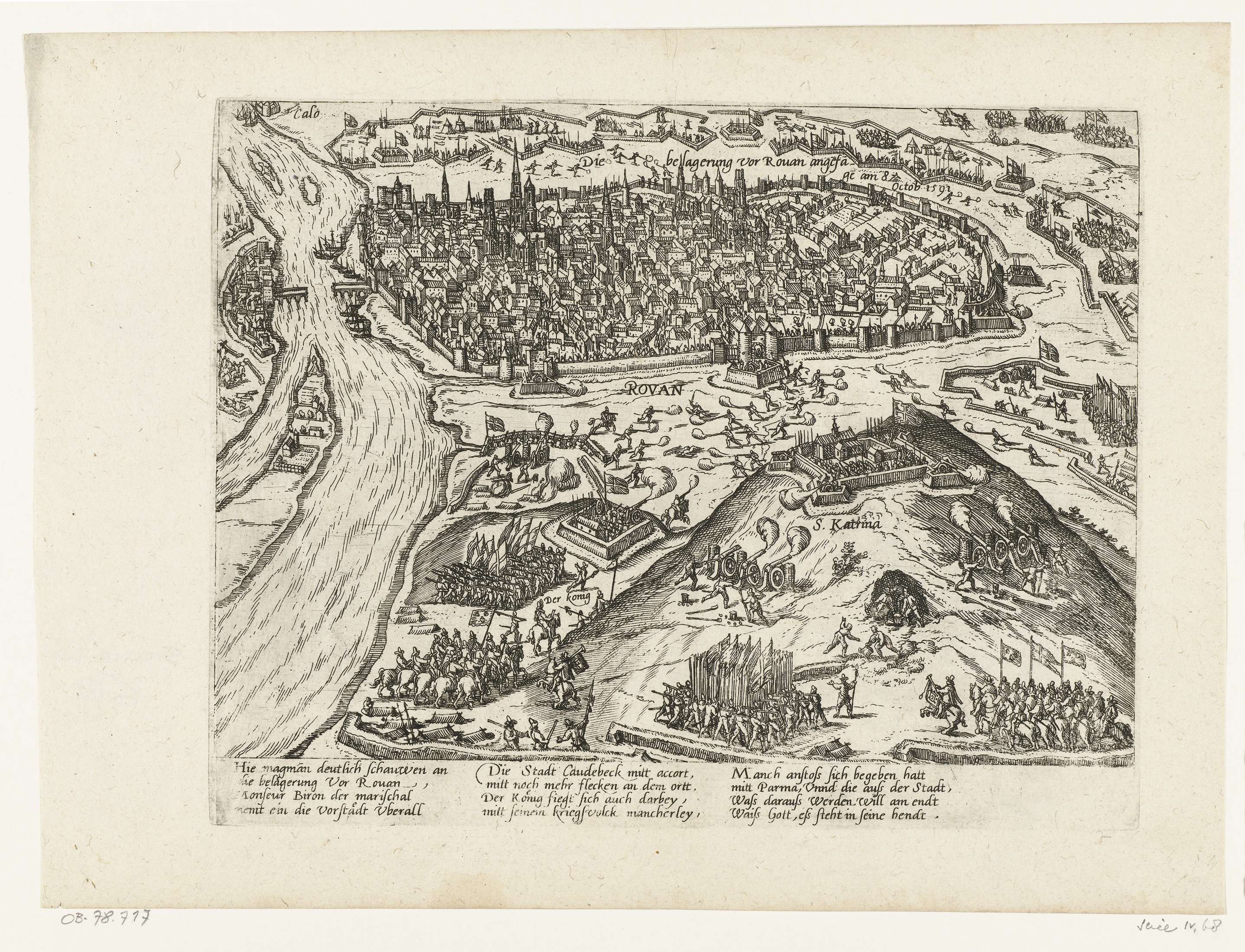 Beleg van Rouen door de troepen van de koning, aangevangen 8 oktober 1591. Gezicht op de ommuurde stad en de er omheen liggende belegerde troepen. Met onderschrift van 12 regels in het Duits. Ongenummerd. Blad afkomstig uit een album dat uit elkaar is gehaald.
