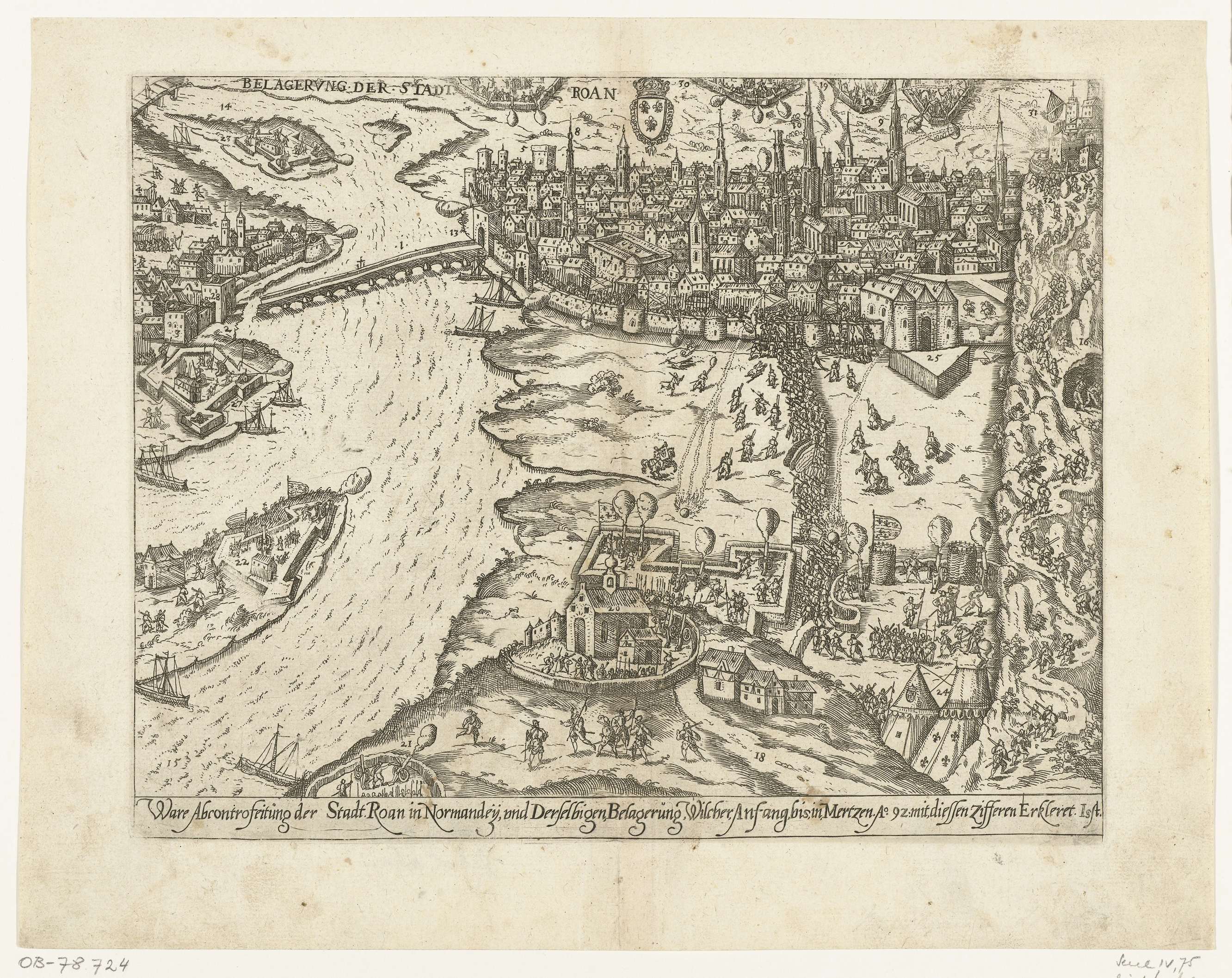 Beleg van Rouen, vanaf maart 1592, door de troepen van de koning. Met onderschrift van 1 regel in het Duits. In de voorstelling de cijfers 1-33. Ongenummerd.