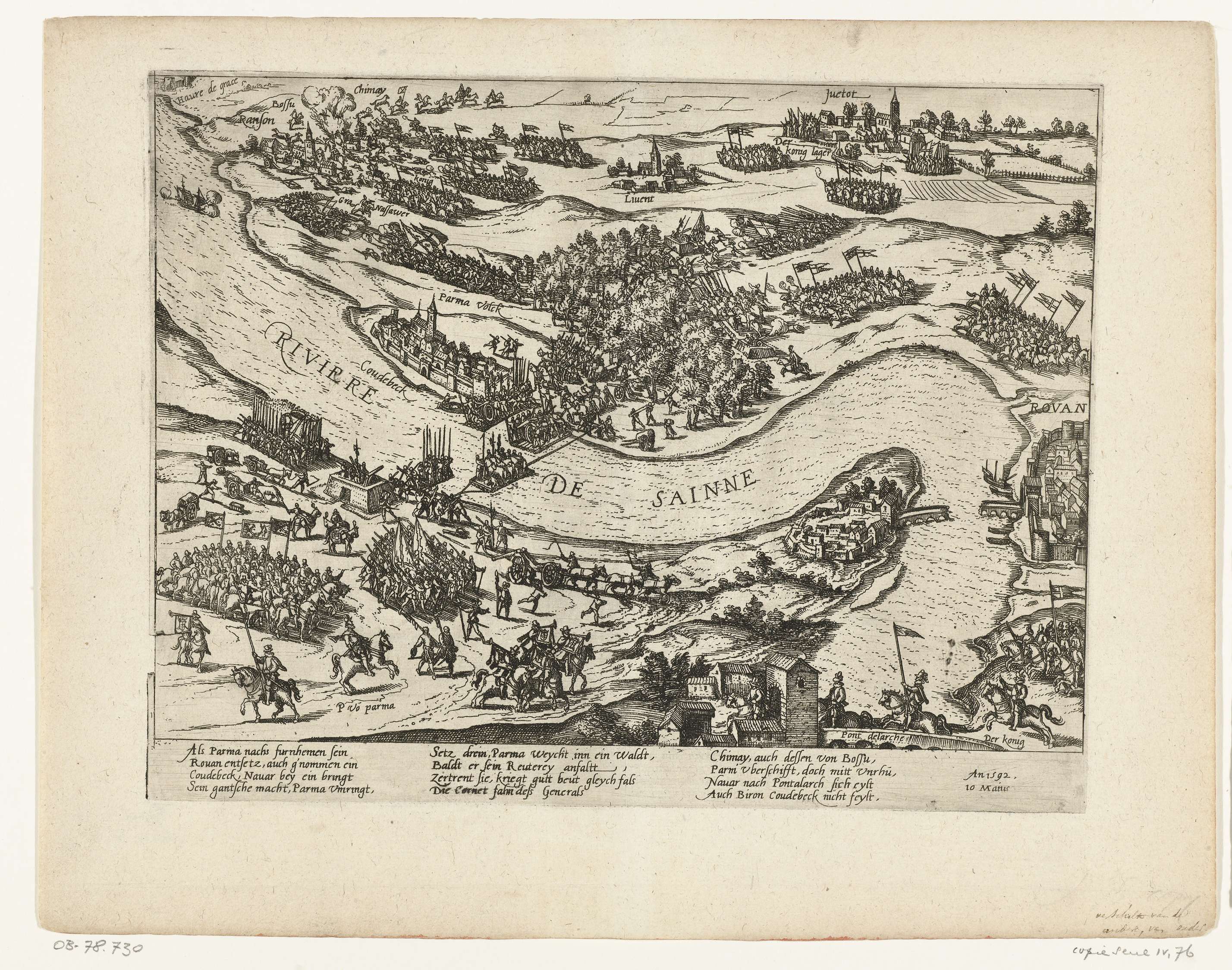 Het leger van de hertog van Parma steekt op vlotten bij Caudebec de Seine over, 10 mei 1592. Rechts onder Rouen en koning Hendrik IV. Met onderschrift van 12 regels in het Duits. Ongenummerd. Papier met rode randjes. Kopie of herhaling naar de prent van Hogenberg.