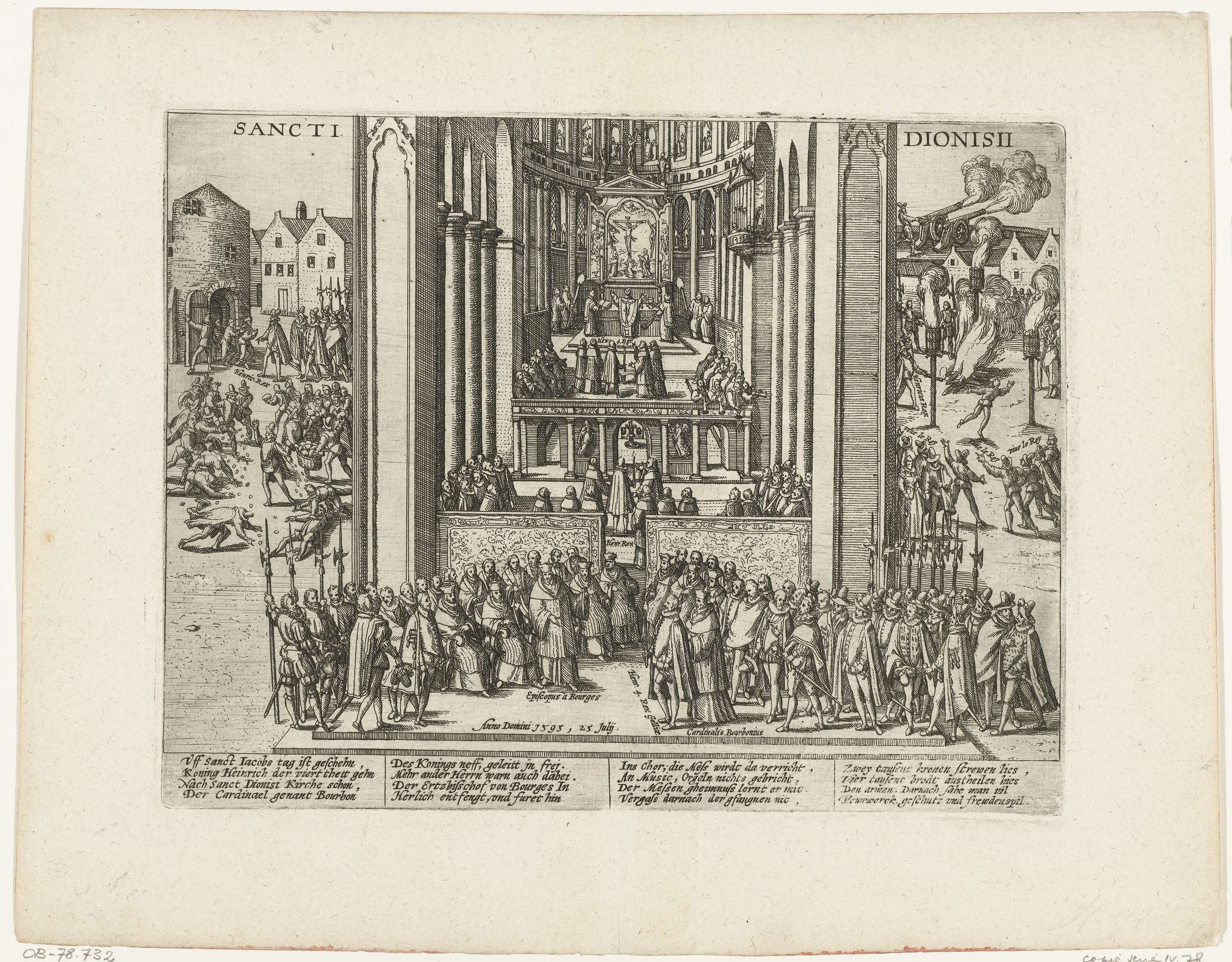 Koning Hendrik IV gaat ter kerk in Saint-Denis, 25 juli 1593. Gezicht in de kerk waar de koning de mis bijwoont. Op de voorgrond de koning met zijn gevolg, de bisschop van Bourges en andere katholieke functionarissen. Buiten feestelijkheden: strooien met munten en brood, vuurkorven en saluutschoten met kanonnen. Met onderschrift van 16 regels in ...