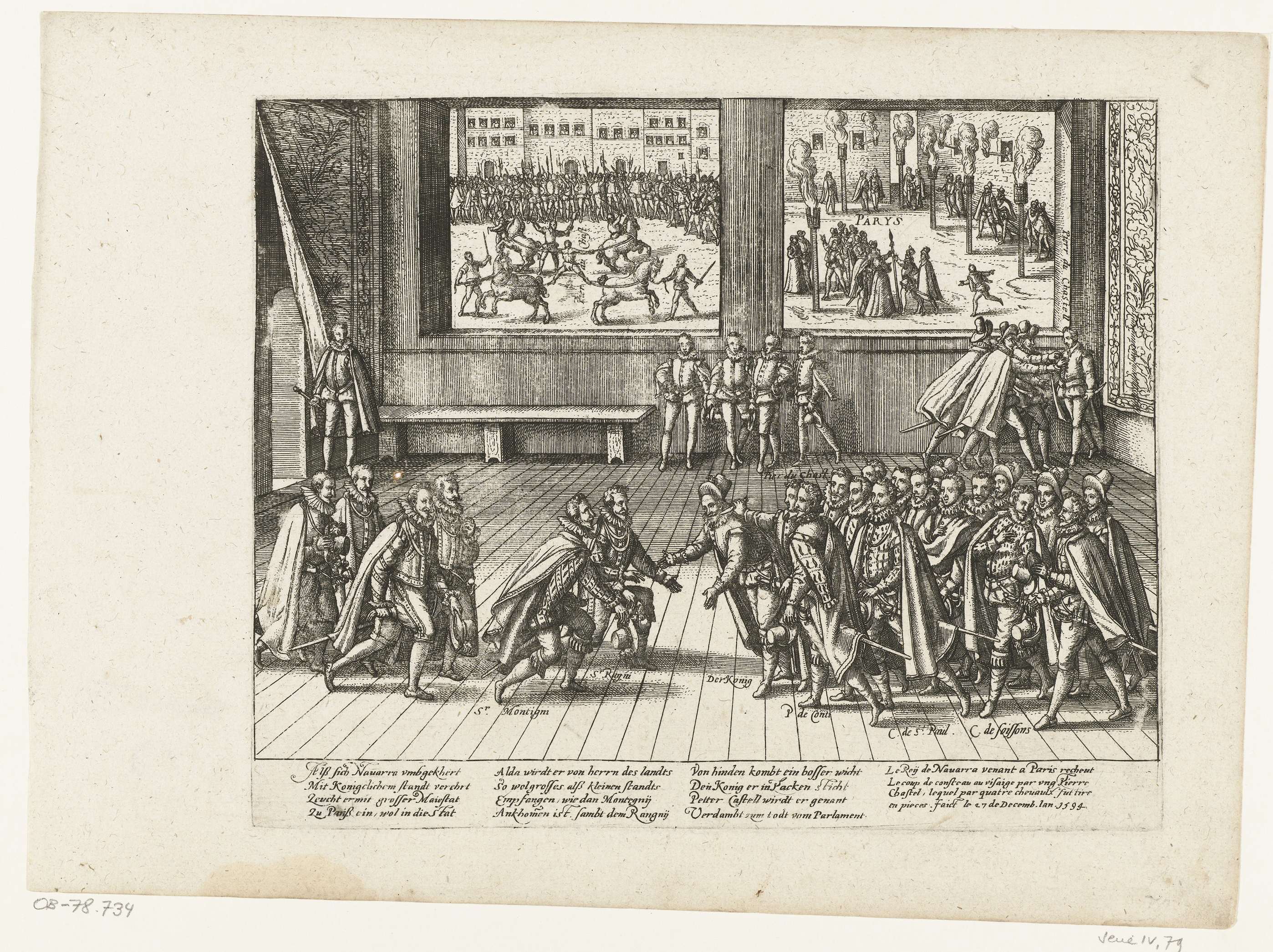Aanslag door Jean Châtel op Hendrik IV, 27 december 1594. In een interieur steekt Châtel de koning met een mes. Op de achtergrond wordt Châtel gevierendeeld. Met onderschrift van 12 regels in het Duits en 4 regels in het Frans. Ongenummerd.