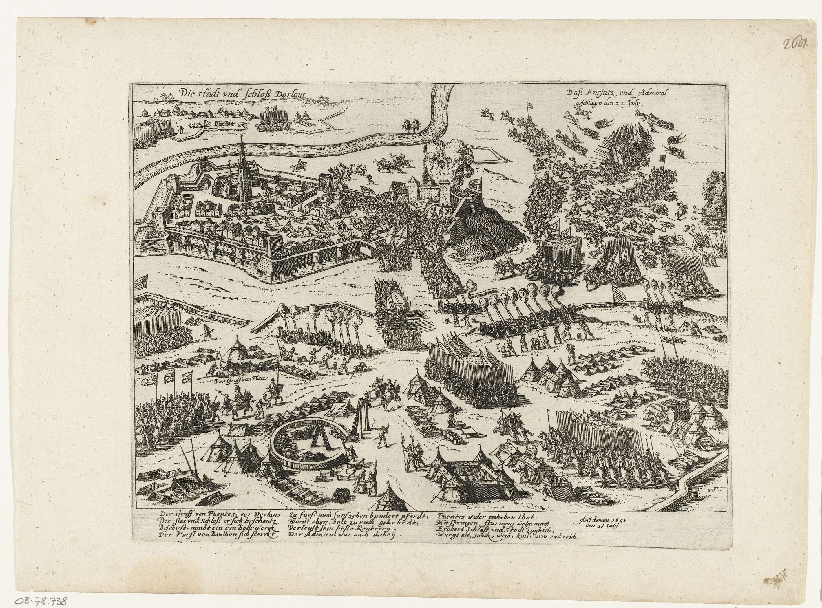 De Spaanse graaf van Fuentes verovert Doullens aan de Somme, 31 juli 1595. Gezicht op het legerkamp van de Spaanse troepen. Met onderschrift van 12 regels in het Duits. Ongenummerd. Blad afkomstig uit een album dat uit elkaar is gehaald. Rechtsboven genummerd (in pen): 268.