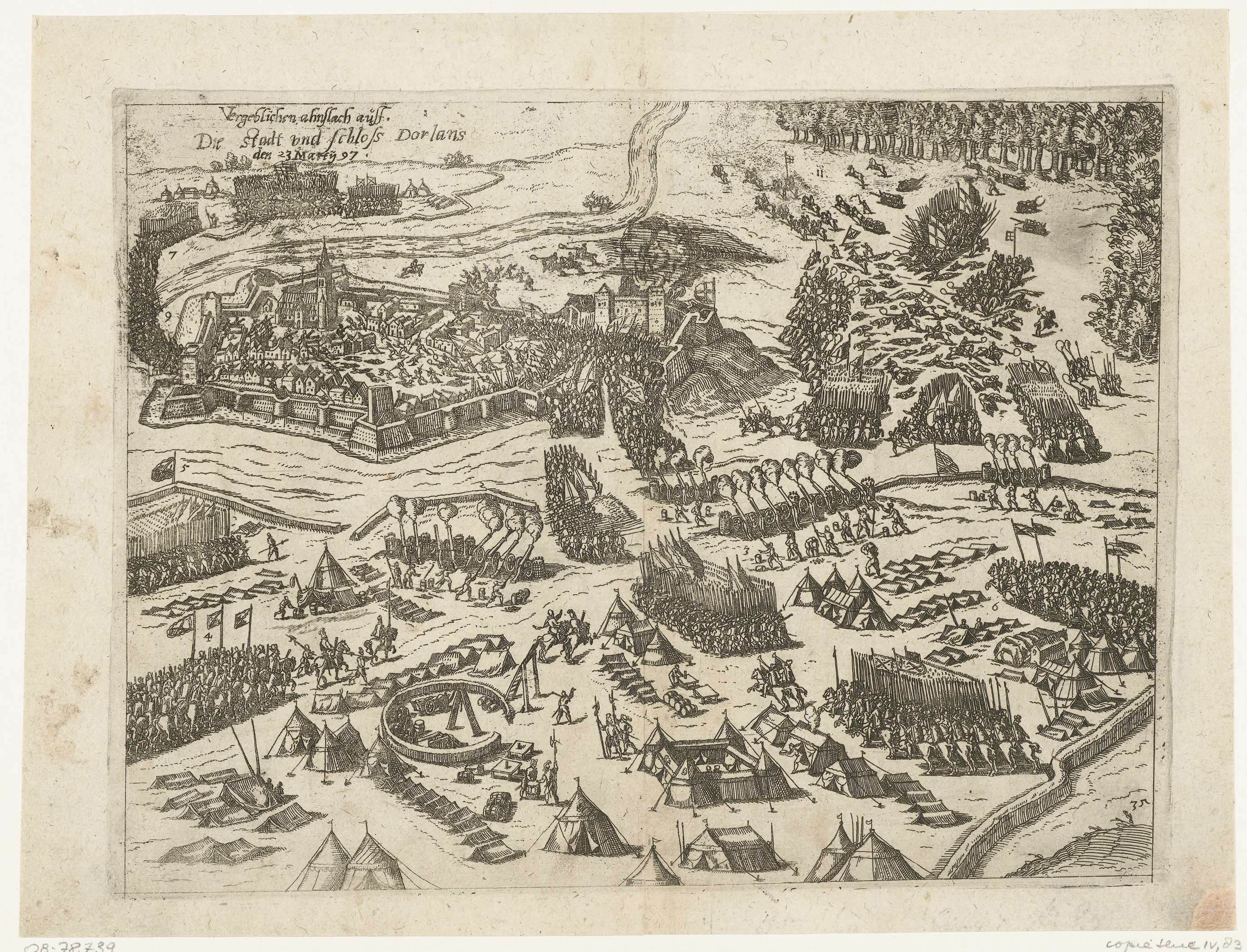 Aanval van een leger op de stad Doullens, 23 maart 1597. Op de voorgrond een legerkamp, rechtsboven gevechten. Zonder onderschrift. Ongenummerd. Kopie naar de prent van Hogenberg van de gebeurtenissen op 31 juli 1595.