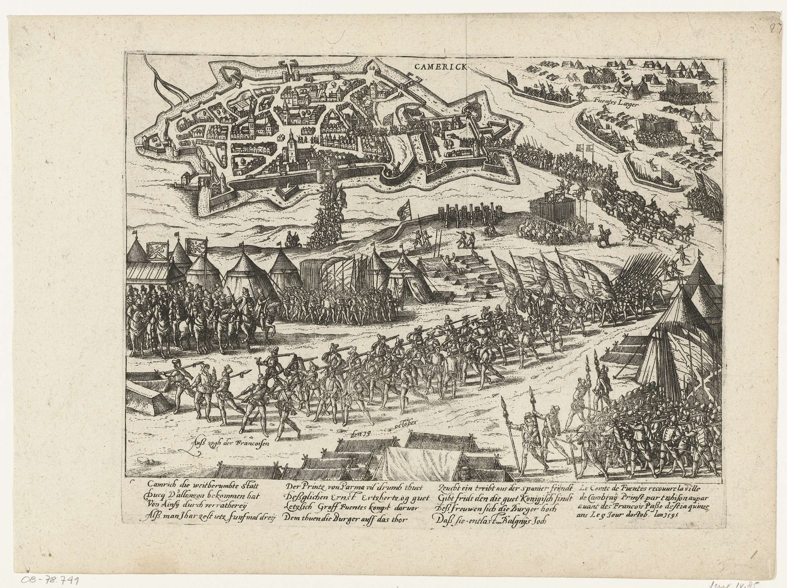 De Spaanse graaf van Fuentes verovert Kamerijk, 19 oktober 1595. De Franse soldaten verlaten Kamerijk. Met onderschrift van 12 regels in het Duits en 4 regels in het Frans. Ongenummerd. Blad afkomstig uit een album dat uit elkaar is gehaald. Rechtsboven genummerd (in pen): 27(.).