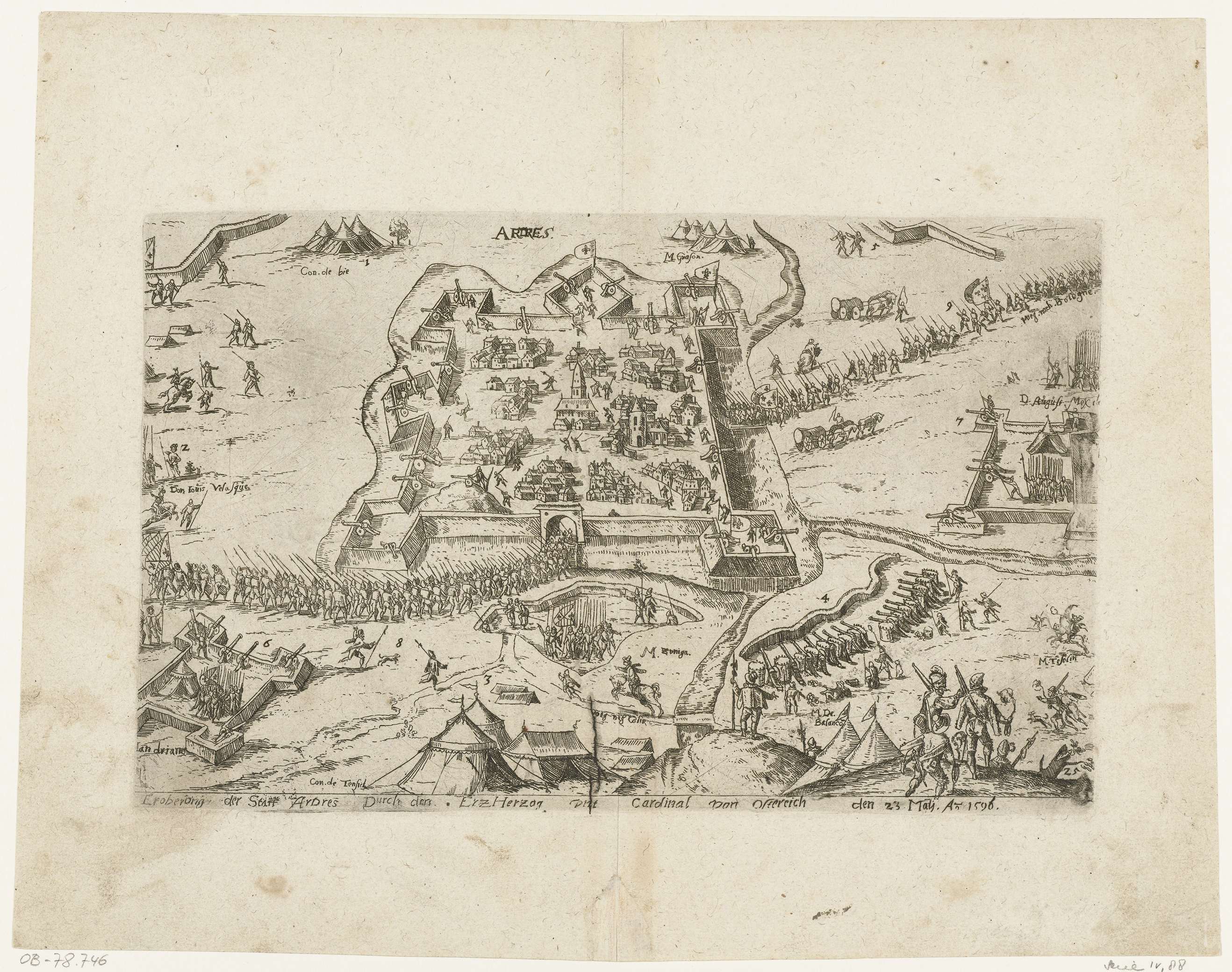 Verovering van Ardres door Albrecht van Oostenrijk, 23 mei 1596. De Franse troepen verlaten de omsingelde stad. Met onderschrift van 1 regel in het Duits. Ongenummerd. Gedeeltelijke kopie naar de prent van Hogenberg.
