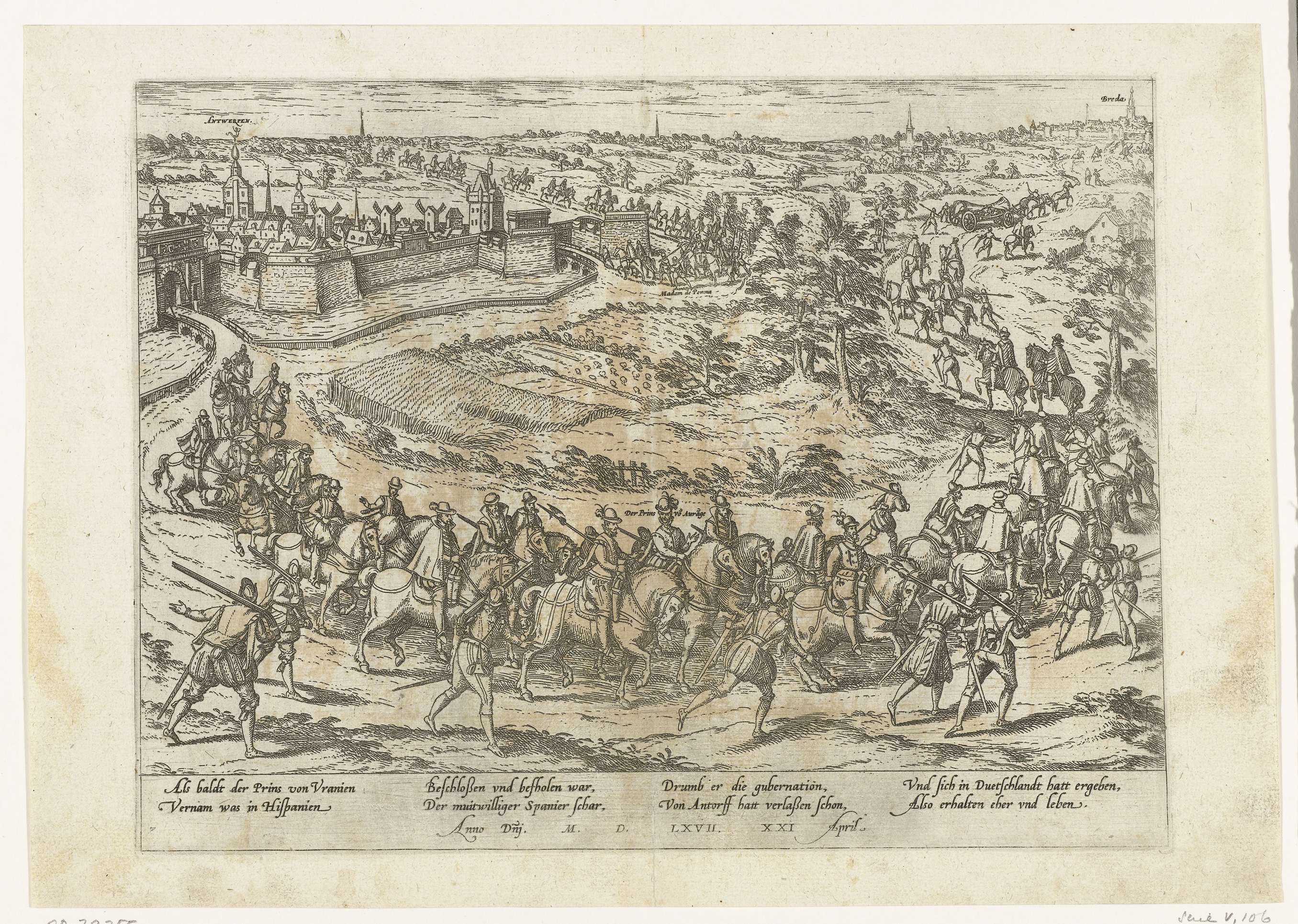 De prins van Oranje vertrekt uit Antwerpen naar slot Dillenburg in Duitsland, 21 april 1567. Stoet met de prins trekt door het land vanuit Antwerpen richting Breda. Met onderschrift van 8 regels in het Duits. Genummerd: 7.