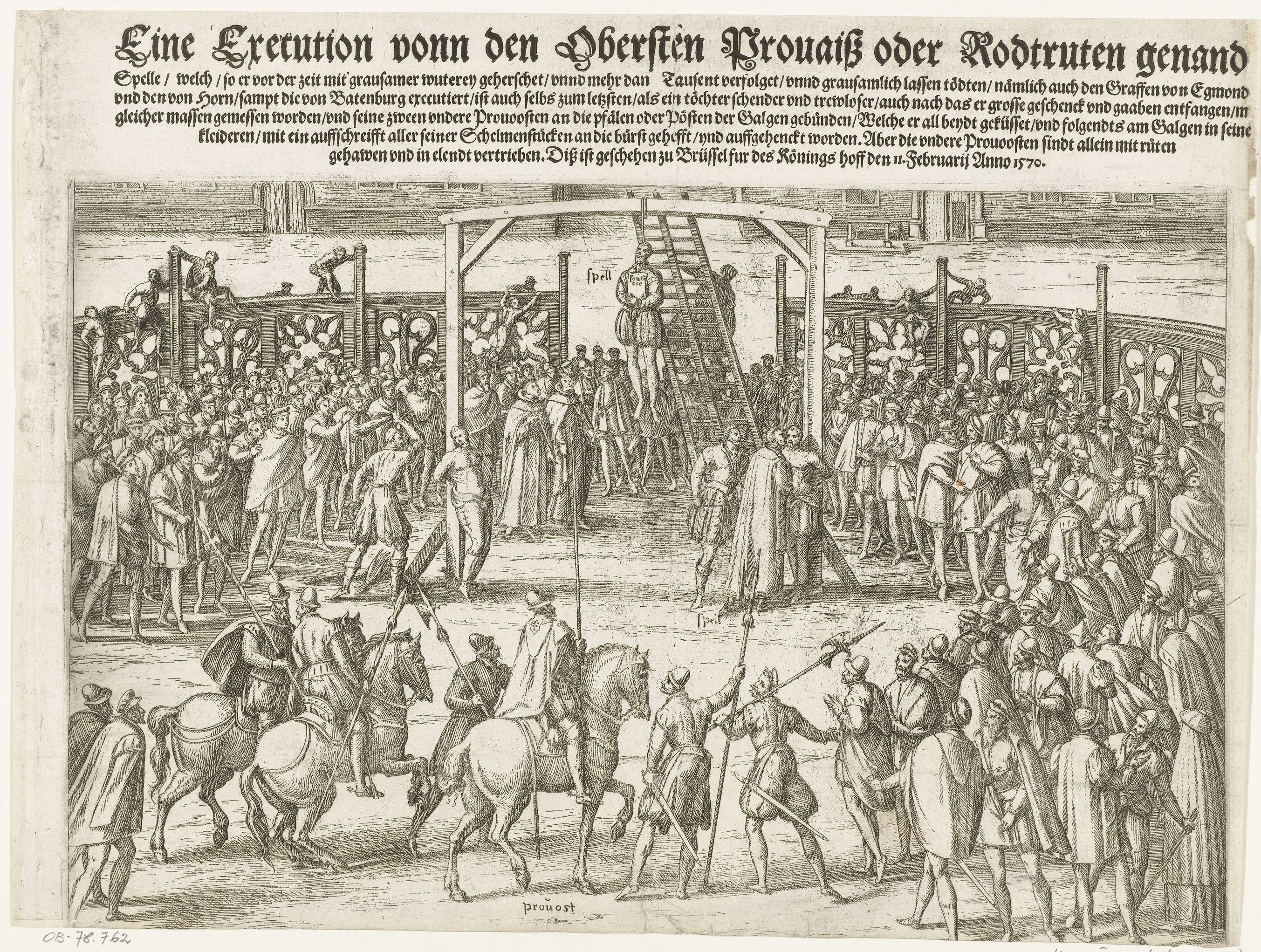 Executie door ophanging op last van Alva van de provoost Hans de Greef, alias Spell of Spelleken te Brussel, 11 februari 1570. Rechts kust Spell een van zijn medewerkers. In het midden hangt Spell aan de galg met zijn vonnis (sentencie) op de borst. Links wordt een andere van zijn medewerkers wordt gegeseld. Dit is ...